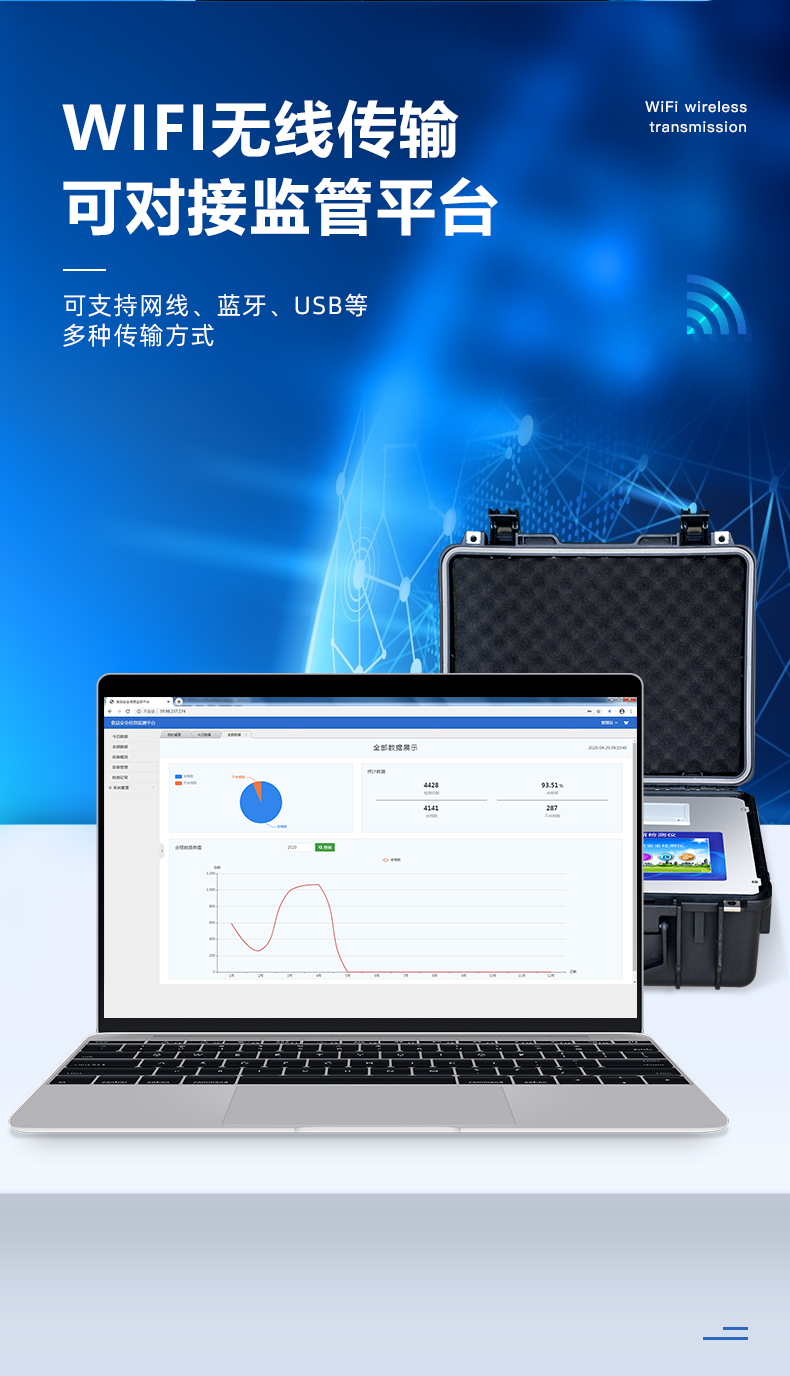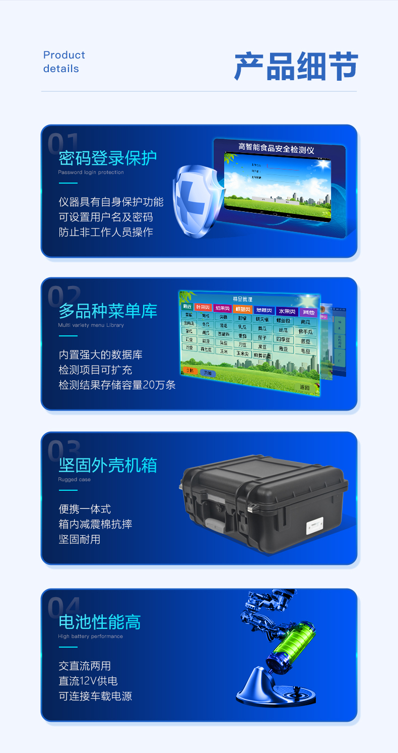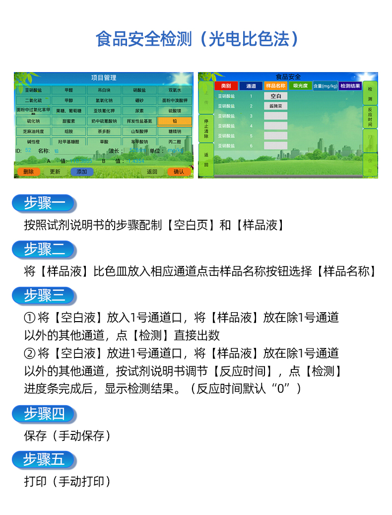 安卓智能操作系统,采用更加**的UI交互界面,仪器具有wifi联网上传、4G联网传输、GPRS无线远传、网线连接功能,快速批量上传数据。 | 智能化程度高,仪器具有自检功能:具有开机自检和调零功能,具有自动检测重复功能。 | 新一代高速热敏打印机,检测完成可自动打印和批量打印检测报告和二维码。 | 仪器带有监管平台,数据可局域网和互联网数据上传,检测结果直接传至食品安全监管平台。进行区域食品安全监管及大数据分析处理与数据统计,检测区域食品安全长短期动态,达到食品安全问题预估、预警 | 一体化主机,包含光电比色测模块、胶体金免疫层析检测模块。 | 一体化便携式快检设备,满足现场及流动检测使用需求,能够在同一软件下实现所有检测项目的检测,并可通过同一窗口直观显示检测结果。 | 胶体金模块检测方式:轨道式自动传输扫描,检测完成后自动退出检测卡。 | 食品安全检测仪CT线自动识别,无需手动调整,检测完成自动显示CT坐标曲线。 | 内置强大的数据库,具有多品类多种类样品菜单功能,可灵活选择检测样品,不同的检测通道可同时检测不同的样品项目。也可在仪器上直接编辑录入样品名称、检测指标、检测单位等信息并保存进样品数据库。 | 仪器内置操作演示视频,是您身边的化验指导专家。 | 仪器具有自身保护功能,可设置用户名及密码,防止非工作人员操作等。 | 样品处理简单省力,整体操作快速、安全、便捷。 | 高灵敏度,高检测精度,高重复性精度,扫描式高精度光学传感器。 | 结果判定线可修改,对照值标定值可保存,断电不丢失数据。 | 兼容市场上所有的胶体金卡,使用耗材不受限制,极大增强用户使用体验。 | 仪器具有重新校准、锁定、恢复出厂设置功能。 |
