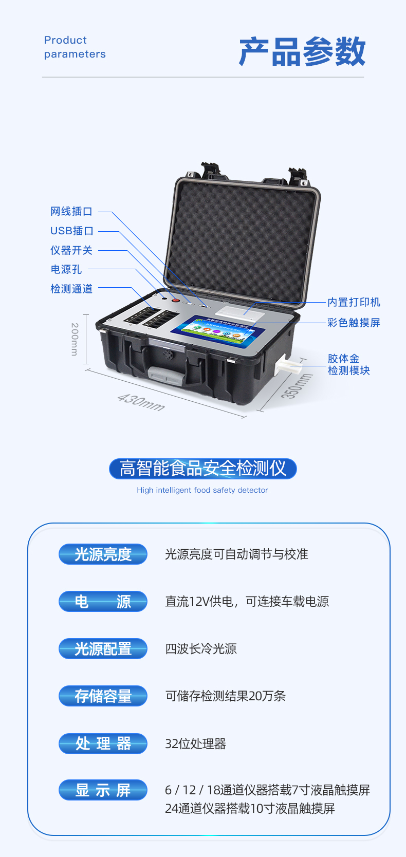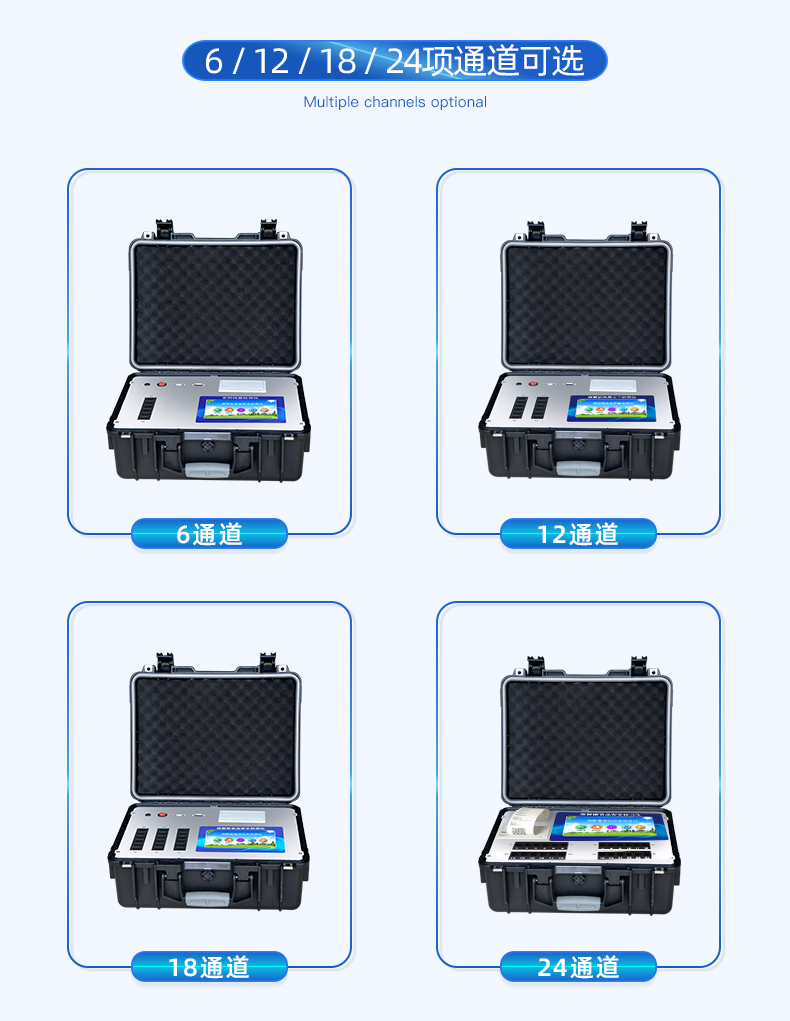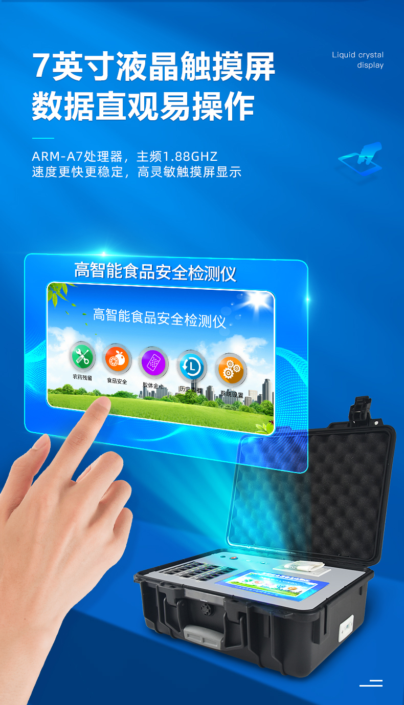 主控芯片采用ARM Cortex-A7,RK3288/4核处理器,主频1.88Ghz,运转速度更快速,稳定性更强。 | 显示方式:7英寸液晶触摸屏显示,人性化中文操作界面,读数直观、简单。 | 交直流两用,直流12V供电,可连接车载电源,可配6ah大容量充电锂电池,方便户外流动测试。 | 四波长冷光源,12个检测通道,每个通道均配置410、520、590、630nm波长光源,标配**的光路切换装置,专业光路切换功能可实现*多64波长,并且所有检测项目可实现所有通道同时检测。 | 智能恒流稳压,光强自动调节与校准,长时间连续工作光源无温漂现象。 | 内置新国家限量标准,与所测结果进行现场比对,并持续更新标准。 | 不间断进样,连续检测 | 样本编号自动累加 | 数据无线上传平台,并可从平台导出为Excel表格 | 检测结果存储容量20万条 | 同时支持U盘拷贝,标准USB接口,免驱动插拔。 | 检测项目可扩充,固件可升级 | 仪器尺寸:43×35×19cm, 主机净重:5.1kg |