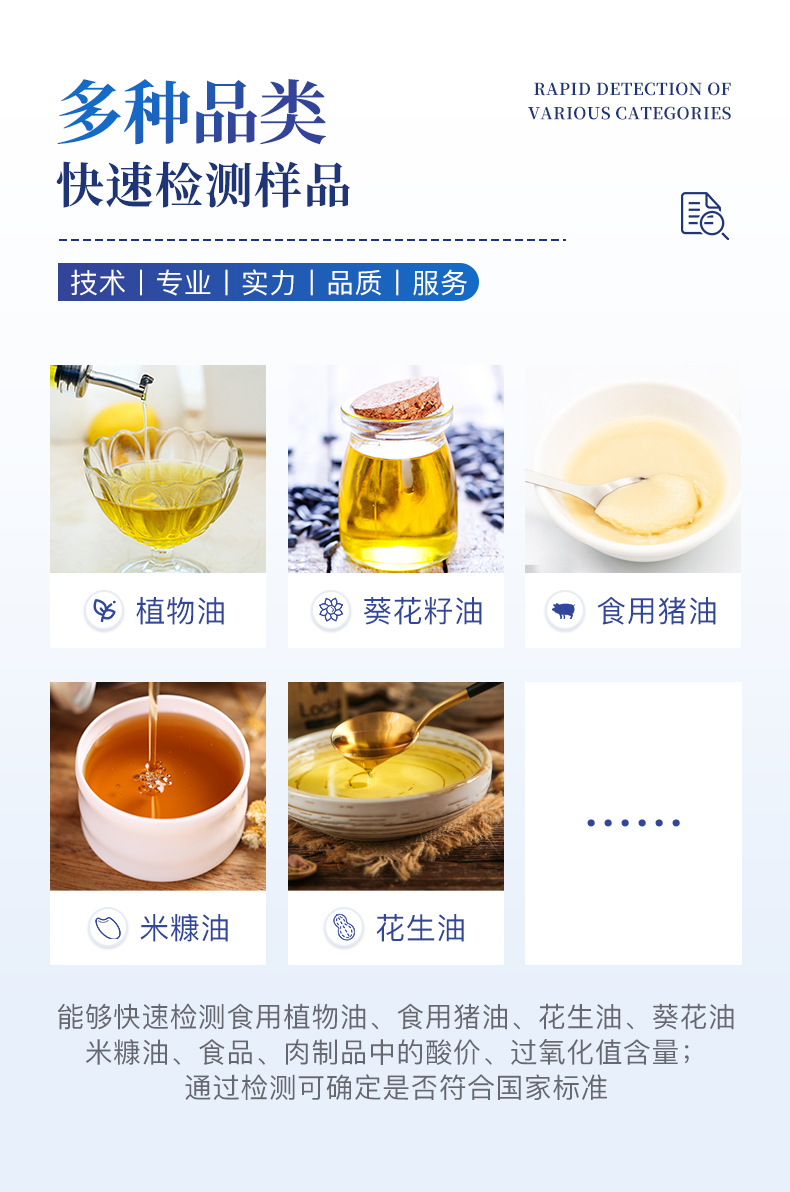 产品用途: 食用油过氧化值检测仪为集成化油品快速检测分析设备,能够快速检测食用植物油、食用猪油、花生油、葵花油、米糠油、食品、肉制品中的过氧化值含量;通过检测可确定植物油是否符合国家···     更新时间:2025-11-22