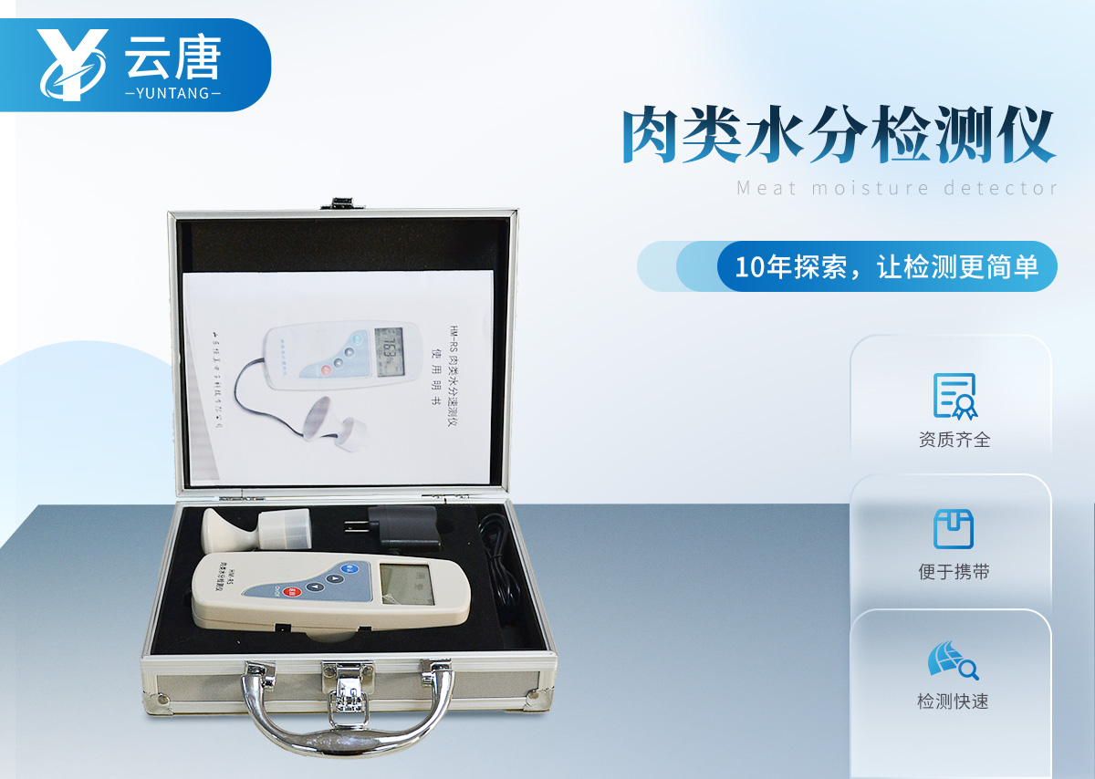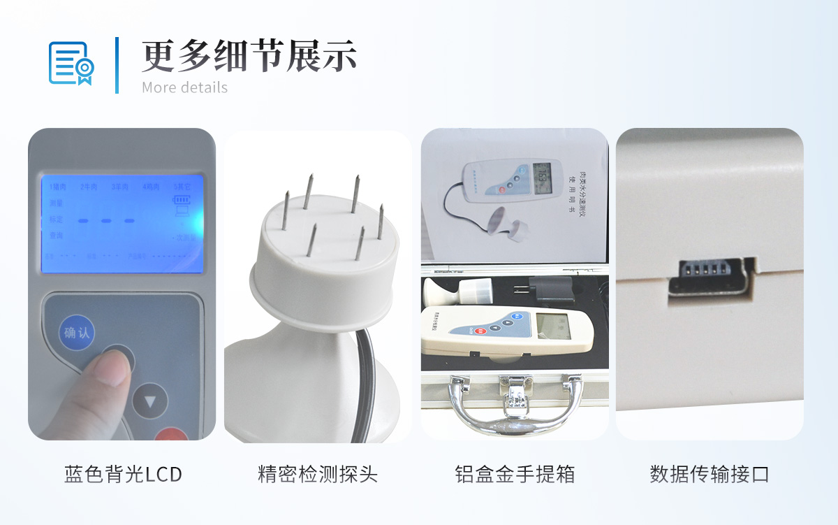 肉类水分检测仪主要用于快速猪肉、牛肉、鸡肉等动物肉类水分含量,从而判断所测样品是否为注水肉,该仪器设计精巧,单手可持,仪器可根据测定对象的品种,设定相应的判断标准值。