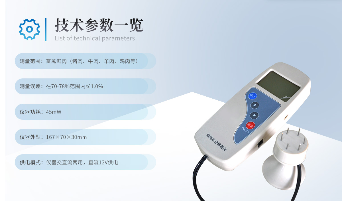 畜禽鲜肉(猪肉、牛肉、羊肉、鸡肉等) | 65~85% | 一次采样时间< 1s | 每10次采样或1次采样输出一次测量结果 | 在70~78%范围内≤1.0% | 在70~78%范围内≤ 0.5% | 超标报警 | 可设定每个品种的判断标准。 | 交直流两用 | 触摸式按键 | 45mW | 167×70×30mm | 蓝色背光LCD | 0~40℃ | 20~90 % RH | USB接口 |