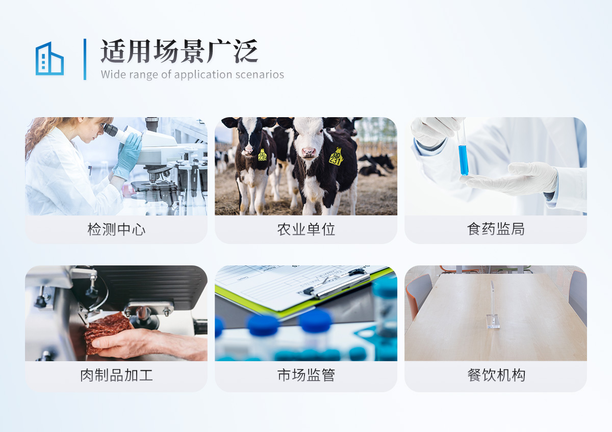 便于携带,单手可持 | 可根据测定对象的品种,设定相应的判断标准值 | 操作简便,检测人员无需专业技能知识 | 检测时间短,每个样品2分钟内出结果; | 检测试验无需其他耗材及试剂 |
