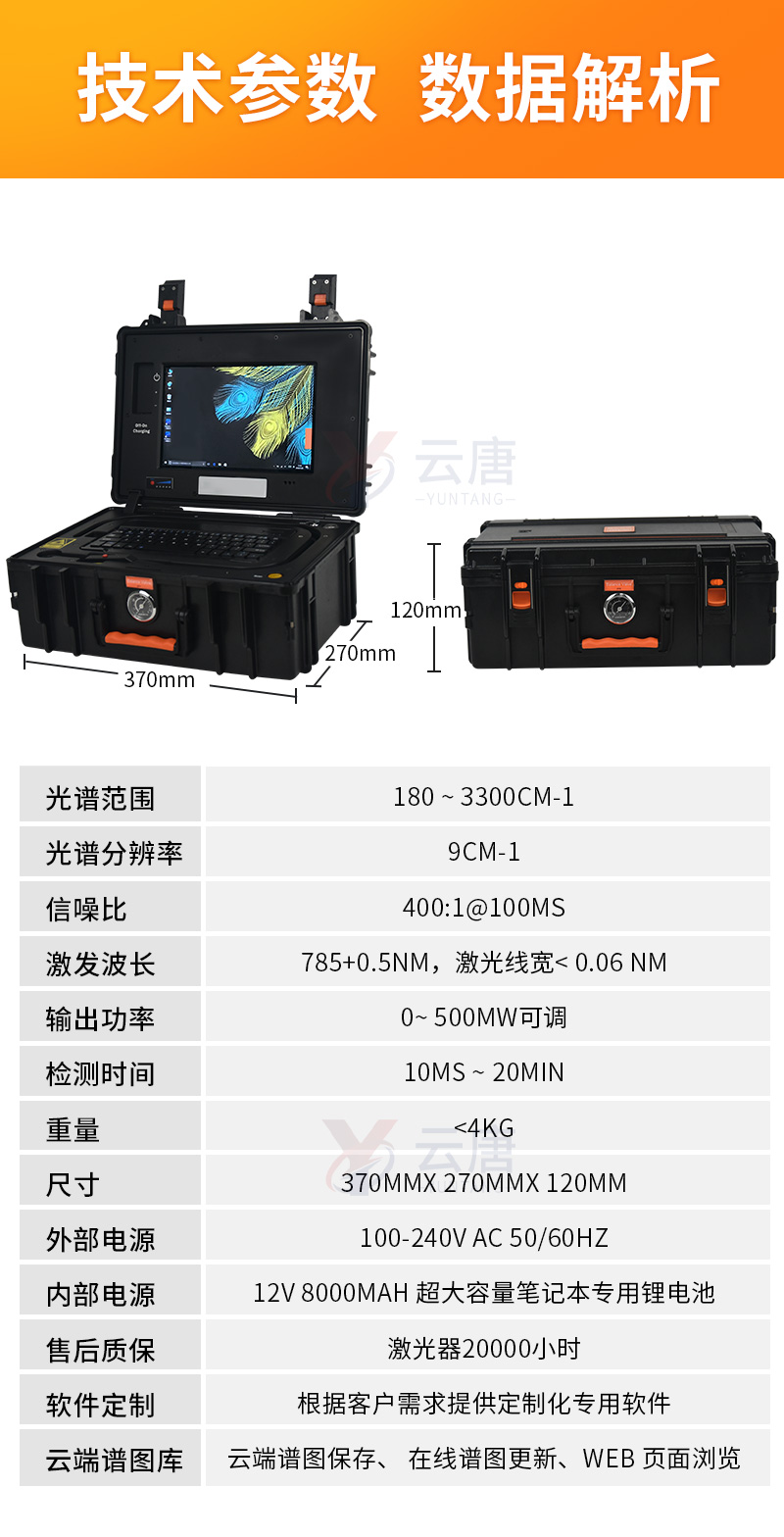 尺寸:440×320×140mm | 重量:11kg | 光谱范围:200-3000cm-1 | 光谱分辨率:<10cm-1@25μm Slit | 光谱频移示值误差:<3cm-1 | 激发波长:785±0.5nm,线宽≤0.08nm | 激光器使用寿命:10,000.00hrs | 输出功率:0-500mW可调 | 积分时间:1ms-65s | 电池:可充电锂电池,续航时间>5 小时 | 数据传输:USB2.0/WiFi/4G(可选) |