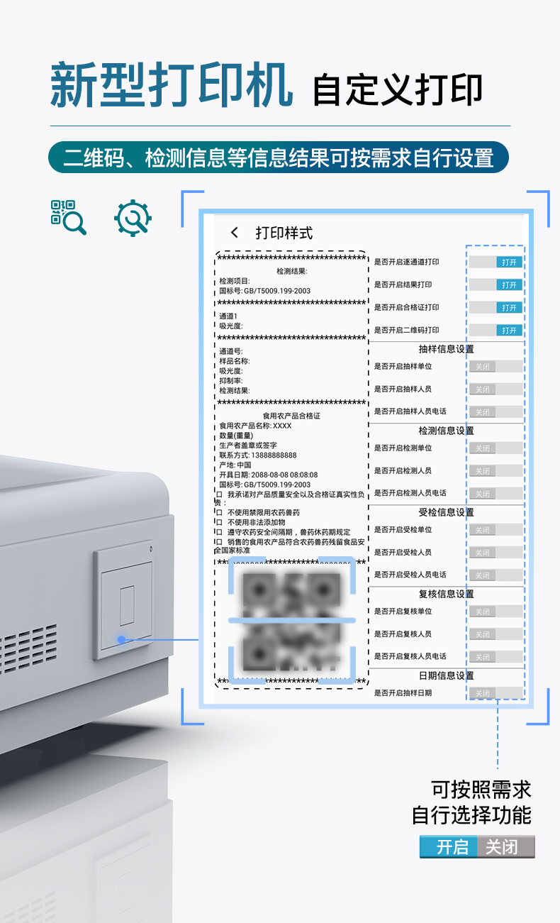 仪器采用台式一体化系统检测技术,将分光光度模块、胶体金检测模块、新型农残检测模块、数字化管理模块、无线通讯模块高度集成于一体,支持检测200种食品安全检测项目,同时预留升级检测方法。仪器检测模块标准化、智能化,可随意自由组合。检测箱体内置多个标准检测单元,检测模块可以调整配置。 仪器采用全新安卓智能系统,主控芯片采用 ARM Cortex-A7,RK3288/4核处理器,10.1寸高清液晶触摸竖屏,更加**的UI交互界面,运转快捷;仪器配备无线通信模块: 4G(APN)通讯模块、Wifi模块,蓝牙传输,同时具有双USB接口以及RJ45接口能以多种方式实现数据保存和数据传输功能。创新检测模式★检测通道:≥12通道;采用精密旋转比色池设计,使用同芯片同光源校准精度,解决不同光源之间的误差值。1-12通道间误差0.1%。(***:ZL202022821055.2) ★仪器具有自动识别比色皿检测功能,即:将样品比色皿放入仪器后,点击样品检测,仪器自动识别比色皿进行通道检测。进口高精光源:高精度进口四波长冷光源,通道配置 410、520、590、630nm 波长光源,一个光源芯片驱动一个光源,误差极小,每台设备单独**校准光源,**比对,同时参照四种不同波段光源全方位覆盖市面上99%的农残食品项目检测。胶体金模块检测方式:★采用COMS实时成像技术,可采集多个画面,支持2个金标同时读卡,通过不同颜色的灰度变化,一秒精准得出结果。智能操作分析系统:★便捷操作系统:设备检测时可在同一检测界面自动对应相关检测通道一次性选择1-12个样品名称,无须退出界面,节省操作时间。(需提供对应证明) ★数据集成系统:设备首页自动统计检测数据包含:周检测数据、月检测数据,全部检测总数量,均包含检测总数,合格数,不合格数,以及相关柱形分析图,对各项检测数据清晰掌握,无需电脑查询,更加快捷直观。(需提供对应证明文件)★项目预设系统:支持添加单个及多个相同或不相同的任务预设,一键快速调取,每一个任务分别可以设置不同的样品、批次、编号、来源、备注、抽样信息、检测信息、受检信息、复核信息等更多信息。无缝链接平台和APP实时查看下发任务。(需提供对应证明文件)★数据监管系统:同步对接监管平台,数据可局域网和互联网数据上传,检测结果可选择直接传至食品安全监管平台。集成OSS输出存储服务、区分设备定向管理应用,进行区域食品安全监管及大数据分析处理与数据统计,检测区域食品安全长短期动态,达到食品安全问题预估、预警。(需提供对应食品理化分析系统计算机软件著作权)。★ 自定义打印系统:内置全新打印系统,新创自定义打印方式,可按需灵活设置开启或关闭:产品合格证(国家农业部标准要求),二维码,抽样信息、检测信息,受检信息、复核信息、抽样日期、检测日期等信息的打印。(需提供对应证明)★系统远程更新功能:可定向分客户分仪器更新系统,按照不同客户后期实际需求添加项目,无需机器返厂,即可远程实时升级全新系统,节省时间成本及避免运输造成设备损坏。仪器主机采用一体化防水、抗压、防撞击、防腐蚀箱体设计,同时配备交直流供电,可连接车载电源,可选配大容量充电锂电池,满足现场野外检测需求。安全证书,放心保障:仪器具有中国计量科学研究院校准证书,权威认证。