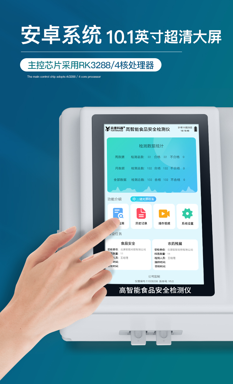 仪器采用台式一体化系统检测技术,将分光光度模块、胶体金检测模块、新型农残检测模块、数字化管理模块、无线通讯模块高度集成于一体,支持检测200种食品安全检测项目,同时预留升级检测方法。仪器检测模块标准化、智能化,可随意自由组合。检测箱体内置多个标准检测单元,检测模块可以调整配置。 仪器采用全新安卓智能系统,主控芯片采用 ARM Cortex-A7,RK3288/4核处理器,10.1寸高清液晶触摸竖屏,更加**的UI交互界面,运转快捷;仪器配备无线通信模块: 4G(APN)通讯模块、Wifi模块,蓝牙传输,同时具有双USB接口以及RJ45接口能以多种方式实现数据保存和数据传输功能。创新检测模式★检测通道:≥12通道;采用精密旋转比色池设计,使用同芯片同光源校准精度,解决不同光源之间的误差值。1-12通道间误差0.1%。(***:ZL202022821055.2) ★仪器具有自动识别比色皿检测功能,即:将样品比色皿放入仪器后,点击样品检测,仪器自动识别比色皿进行通道检测。进口高精光源:高精度进口四波长冷光源,通道配置 410、520、590、630nm 波长光源,一个光源芯片驱动一个光源,误差极小,每台设备单独**校准光源,**比对,同时参照四种不同波段光源全方位覆盖市面上99%的农残食品项目检测。胶体金模块检测方式:★采用COMS实时成像技术,可采集多个画面,支持2个金标同时读卡,通过不同颜色的灰度变化,一秒精准得出结果。智能操作分析系统:★便捷操作系统:设备检测时可在同一检测界面自动对应相关检测通道一次性选择1-12个样品名称,无须退出界面,节省操作时间。(需提供对应证明) ★数据集成系统:设备首页自动统计检测数据包含:周检测数据、月检测数据,全部检测总数量,均包含检测总数,合格数,不合格数,以及相关柱形分析图,对各项检测数据清晰掌握,无需电脑查询,更加快捷直观。(需提供对应证明文件)★项目预设系统:支持添加单个及多个相同或不相同的任务预设,一键快速调取,每一个任务分别可以设置不同的样品、批次、编号、来源、备注、抽样信息、检测信息、受检信息、复核信息等更多信息。无缝链接平台和APP实时查看下发任务。(需提供对应证明文件)★数据监管系统:同步对接监管平台,数据可局域网和互联网数据上传,检测结果可选择直接传至食品安全监管平台。集成OSS输出存储服务、区分设备定向管理应用,进行区域食品安全监管及大数据分析处理与数据统计,检测区域食品安全长短期动态,达到食品安全问题预估、预警。(需提供对应食品理化分析系统计算机软件著作权)。★ 自定义打印系统:内置全新打印系统,新创自定义打印方式,可按需灵活设置开启或关闭:产品合格证(国家农业部标准要求),二维码,抽样信息、检测信息,受检信息、复核信息、抽样日期、检测日期等信息的打印。(需提供对应证明)★系统远程更新功能:可定向分客户分仪器更新系统,按照不同客户后期实际需求添加项目,无需机器返厂,即可远程实时升级全新系统,节省时间成本及避免运输造成设备损坏。仪器主机采用一体化防水、抗压、防撞击、防腐蚀箱体设计,同时配备交直流供电,可连接车载电源,可选配大容量充电锂电池,满足现场野外检测需求。安全证书,放心保障:仪器具有中国计量科学研究院校准证书,权威认证。