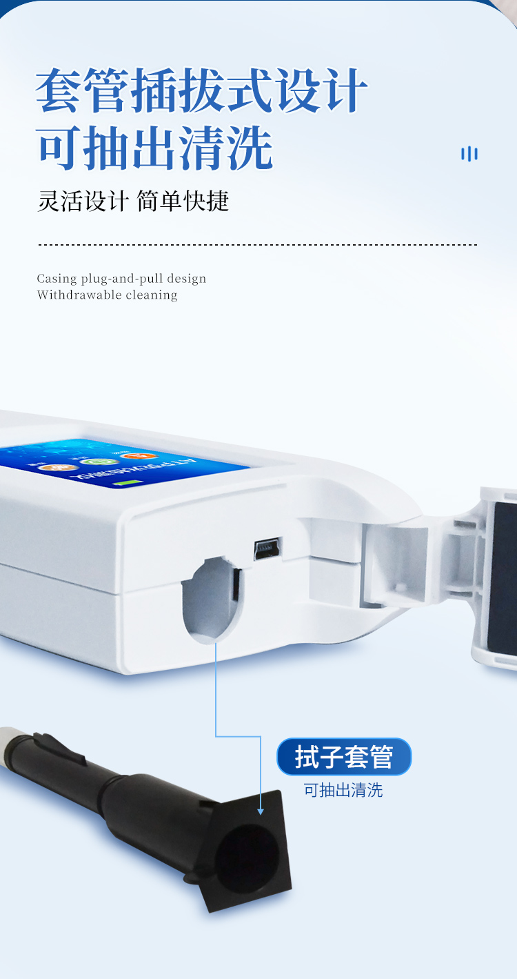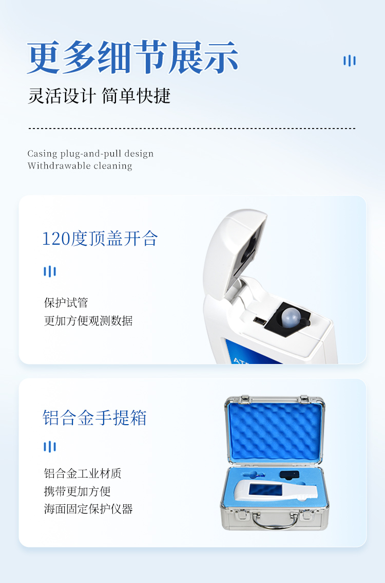 实用性 —— 可根据环境检测需求设定上下限值,做到数据快速评估预警,表面洁净度快速筛查。 | 灵敏度高 —— *************** | 速度快 —— 常规培养法18-24h以上,而ATP只需要十几秒钟 . | 可行性 —— 微生物数量与微生物体内所含ATP有明确的相关性。 通过检测ATP含量,可间接得出反应中微生物数量 | 可操作性 —— 传统培养方法需要在实验室由经过培训的技术人员进行操作;而ATP快速洁净度检测操作非常简便,只需简单的培训即可由一般工作人员进行现场操作。 | 体验更好 —— 试子套管采用插拔式灵活设计,可定期清洗长期使用,延长仪器寿命。 |