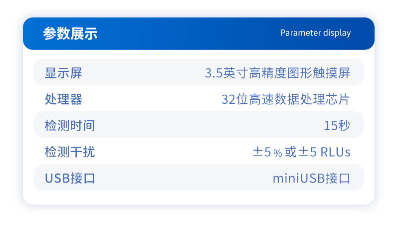 显示屏:3.5英寸高精度图形触摸屏 | 处理器:32位高速数据处理芯片 | 检测精度:********** | 大肠菌群:******** | 检测范围:*************** | 检测时间:15秒 | 检测干扰:±5﹪或±5 RLUs | 操作温度范围:5℃到40℃ | 操作湿度范围:20—85﹪ | ATP回收率:90-110% | 检出模式:RLU、大肠菌群筛查 | 50个用户ID 设定 | 可设定的结果限值个数:251个 | 自动判断合格与不合格 | 自动统计合格率 | 内置自校光源 | 开机30秒自检 | 配有miniUSB接口,可将结果上传至PC | 配备专用软件驱动U盘代替传统光盘 | 仪器尺寸(W×H×D):188 mm×77mm×37mm | 使用可充电锂电池免电池更换 | 备用状态(20℃):6个月 | 中文操作手册 | 稳定的液体荧光素酶 | 润湿的一体化采集拭子 |