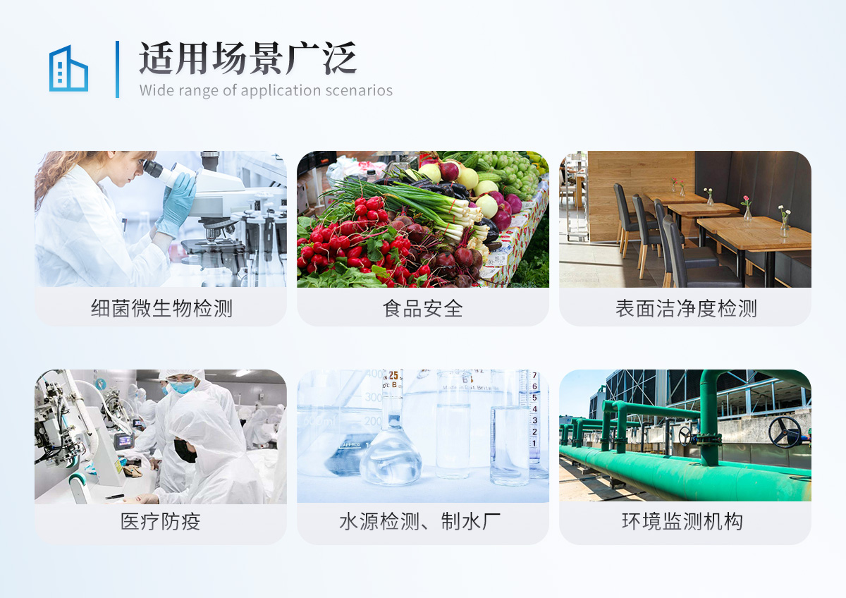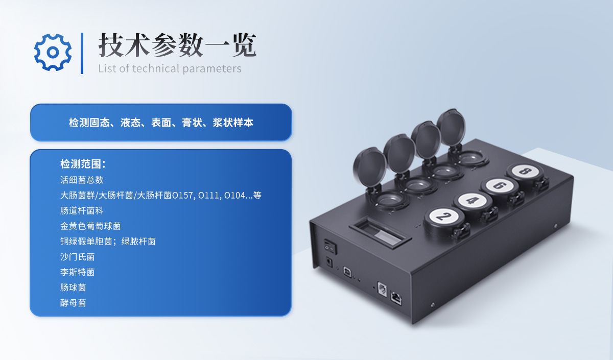 可实现活菌总数、嗜常温菌总数(22℃)、嗜常温菌总数(30℃)、大肠杆菌O157:H7、大肠菌群、沙门氏菌、单核增生李斯特菌、金黄色葡萄球菌、阪崎肠杆菌、肠球菌、乳杆菌、酵母菌、真菌、副溶血性弧菌等微生物快速检测; | 检测原理:融合定性培养、代谢物显色技术、颜色实时监测传感技术与一体; | 技术优势:样品无需前处理、无需提取,即可直接检测; | 传感器:三色(或以上)颜色传感器; | 内置3组模块,每个模块独立控温:温度范围:15~65℃,控温精度:±1℃ ; | 共18个检测通道,可同时检测18个样品,每个通道均可检测任意项目; | 系统运行环境:安卓/windows; | 箱体:便携一体式手提箱设计,自带手柄方便携带,防水、抗压、抗震; | 显示:≥10寸电容式液晶触摸屏; | 打印机:内置热敏打印机,支持背胶打印纸; | 通讯方式:wifi模块、蓝牙模块等多种通讯方式; | 运行内存:≥2GB; | 存储空间:≥32G; | 系统重量 ≤ 8kg | 工作电源:自带安全稳定的电源适配器,内置可充电式备用锂电池,市电断电后自动报警,并可维持正常工作半小时以上; | 具光波防护安全装置,操作中如果翻盖则自动暂停分析; | 操作简捷:整个过程在一个单次用量分装的预制反应瓶中即可完成,仅需加样操作,无需其他任何移液操作,也无需前处理; |