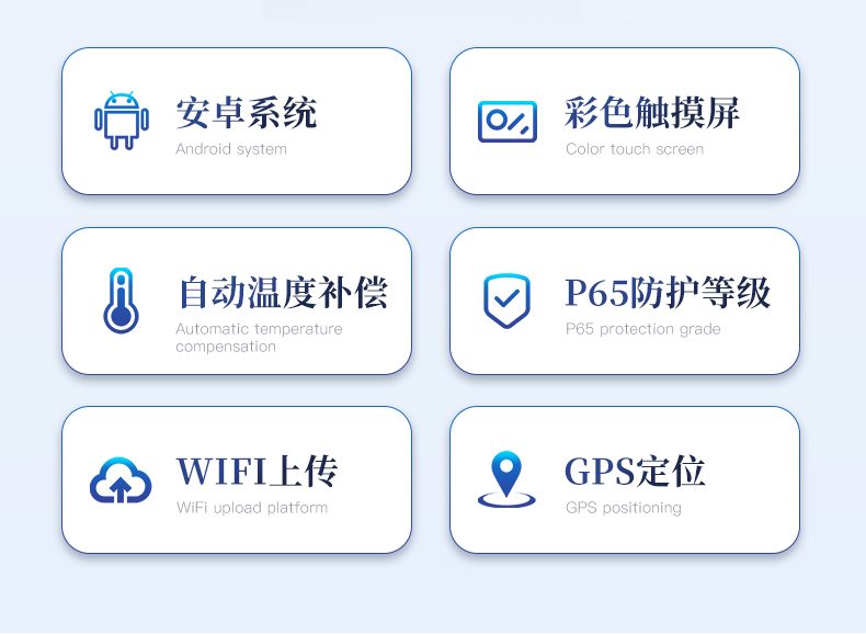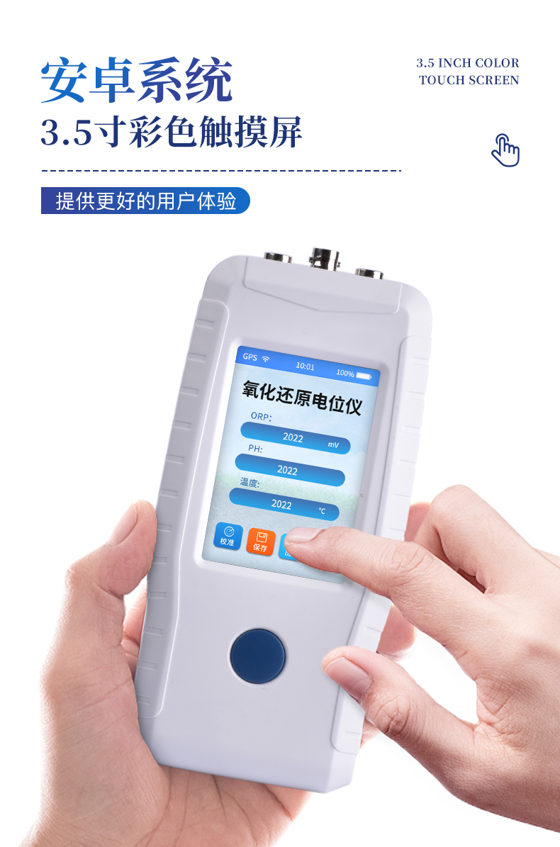 ●ARM Cortex-M3架构处理器,Android系统。 | ●标准Type-c充电,可直接使用手机充电器为设备进行充电。 | ●连续检测,数据采集时间可按min设定。 | ●支持校准 | ●具有自动温度补偿功能,支持手动温度补偿 | ●配套专用ORP电极、参比电极和不锈钢空心杄,可直接插入土壤 | ●具有读数锁定功能(自动读数),测量结果为终结果,无需换算和计算 | ●检测结果可上传。 | ●检测结果可导出Excel表格,连接电脑进行查看。 | ●检测结果存储容量500万条,支持数据存储、查阅。 | ●支持Wi-Fi,检测结果直接传至监管平台 | ●3.5寸彩色触摸屏,提供更好的用户体验。 | ●P65防护等级。 |