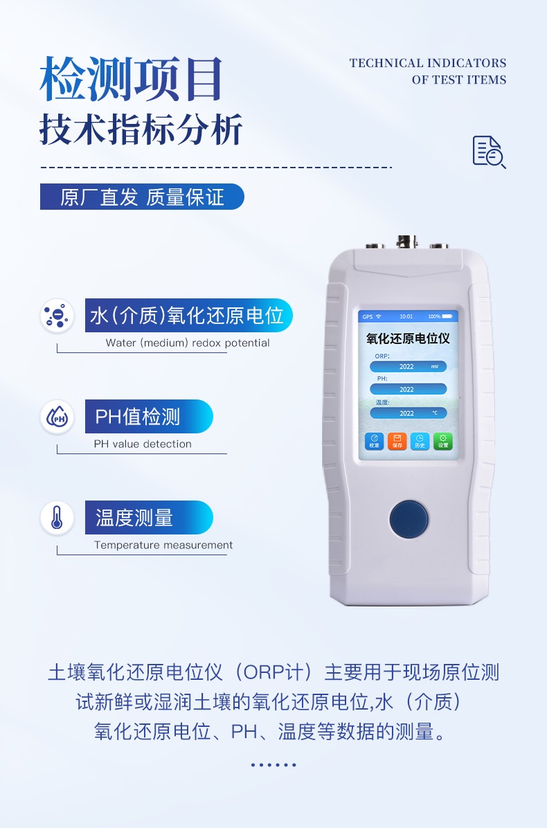 YT-YH土壤氧化还原电位仪(ORP计)主要用于现场原位测试新鲜或湿润土壤的氧化还原电位,水(介质)氧化还原电位、PH、温度等数据的测量。符合《HJ746-2015土壤氧化还原电位的测定电位法》标准。 | 土壤氧化还原电位(ORP/Eh)作为土壤环境条件的一个综合性指标,已沿用很久,它表征介质氧化性或还原性的相对程度,对土壤的化学和生物学过程有重要的影响,是理解土壤的性质和过程的重要参数。氧化还原电位越高,氧化性越强,氧化还原电位越低,还原性越强。电位为正表示溶液显示出一定的氧化性,为负则表示溶液显示出一定的还原性。 | 水质氧化还原电位(oxidationreduction potential ORP)是非常重要的水质指标之一,它虽然不能独立反应水质的好坏,但是能够综合其他水质指标来反应水生系统中的生态环境。1.工业污水处理:用于水处理上的氧化还原系统,主要是铬酸的还原与氰化物的氧化;2.水的消毒与应用:氧化还原电位能衡量对游泳池水、矿泉水及自来水的消毒效果。因为水中大肠菌的杀菌效率与氧化还原电位有关,所以氧化还原电位是水质的可靠指标;3.养殖行业:氧化还原电位可以反映出水中某些无机物的浓度、水生生物状态、水中含氧量,体现水质宏观氧化还原性,是判断水质状况的一个综合指标。 |