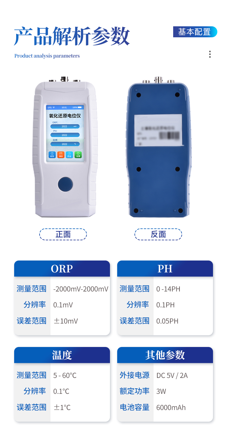 (1)ORP:测量范围 -2000mV——2000mV 分辨率 0.1mV 误差范围 ±10mV | (2)PH: 测量范围 0——14PH 分辨率0.1PH 误差范围:0.05PH | (3)温度:测量范围 5——60℃ 分辨率:0.1℃ 误差范围 ±1℃ | (4)外接电源:DC 5V /2A | (5)额定功率:3W | 6)电池容量:6000mAh |