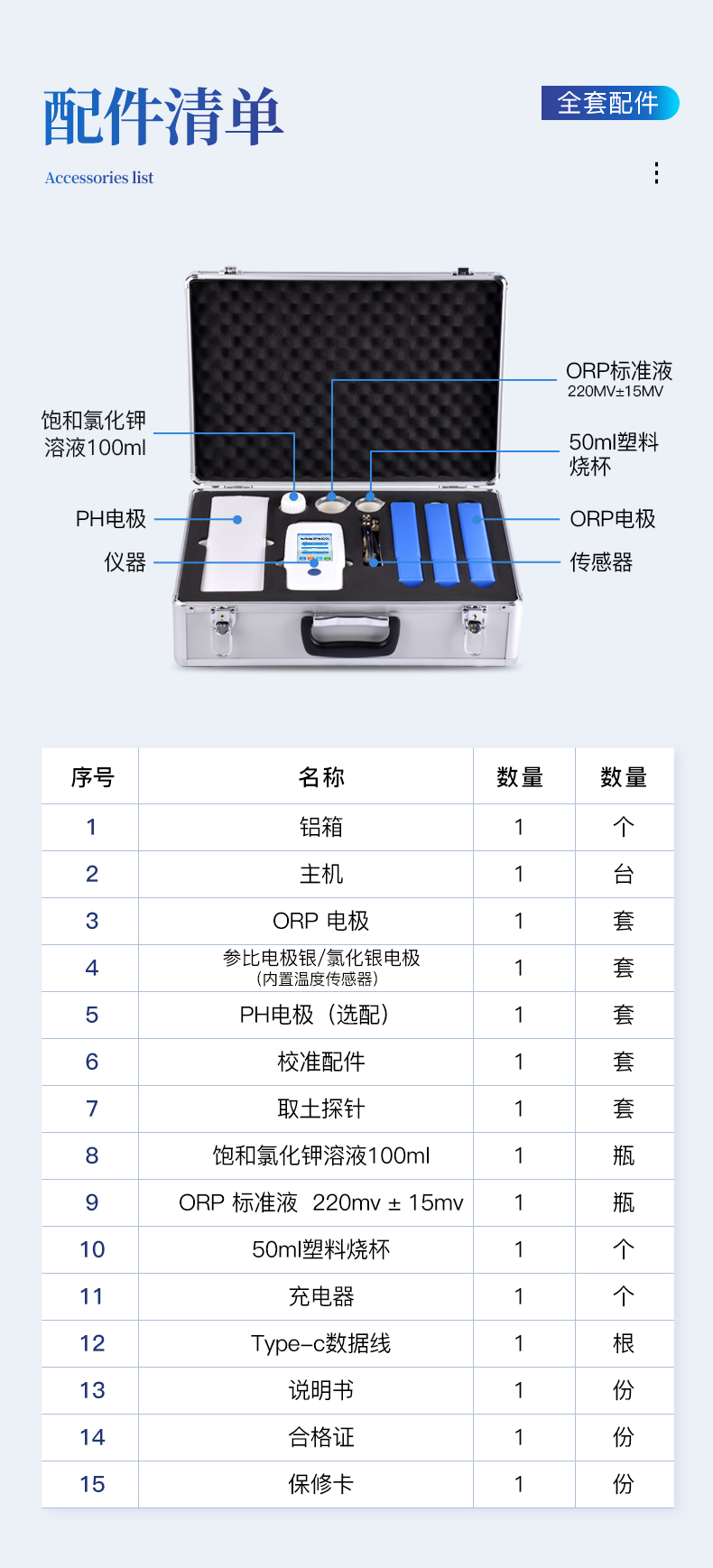 名称 | 铝箱 | 主机 | ORP电极 | 参比电极 | PH电极 | 校准配件 | 取土探针 | 饱和氯化钾溶液100ml | ORP标准液 220mv±15mv | 50ml塑料烧杯 | 充电器 | Type-c数据线 | 说明书 | 合格证 | 保修卡 |