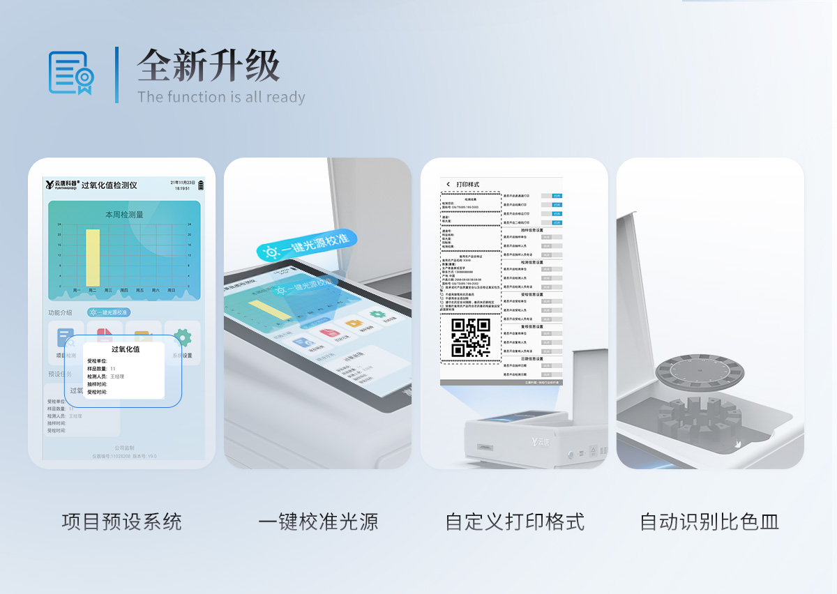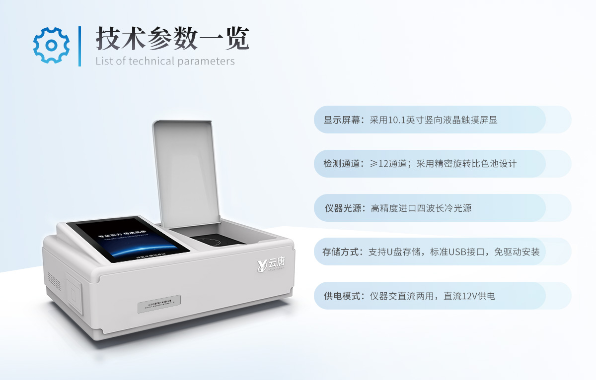 | 仪器采用台式一体化系统检测技术,将分光光度模块、新型农残检测模块、数字化管理模块、无线通讯模块高度集成于一体,支持检测200种食品安全检测项目,同时预留升级检测方法。 | 仪器检测模块标准化、智能化,可随意自由组合。检测箱体内置多个标准检测单元,检测模块可以调整配置。 | 仪器采用全新安卓智能系统,主控芯片采用 ARM Cortex-A7,RK3288/4核处理器,10.1寸高清液晶触摸竖屏,更加**的UI交互界面,运转快捷;仪器配备无线通信模块: 4G(APN)通讯模块、Wifi模块,蓝牙传输,同时具有双USB接口以及RJ45接口能以多种方式实现数据保存和数据传输功能。 | 创新检测模式: | ★检测通道:≥12通道;采用精密旋转比色池设计,使用同芯片同光源校准精度,解决不同光源之间的误差值。1-12通道间误差0.1%。(***:ZL202022821055.2) | ★仪器具有自动识别比色皿检测功能,即:将样品比色皿放入仪器后,点击样品检测,仪器自动识别比色皿进行通道检测。 | 进口高精光源: | 高精度进口四波长冷光源,通道配置 410、520、590、630nm 波长光源,一个光源芯片驱动一个光源,误差极小,每台设备单独**校准光源,**比对,同时参照四种不同波段光源全方位覆盖市面上99%的农残食品项目检测。 | 智能化操作系统: | 便捷操作系统:设备检测时可在同一检测界面自动对应相关检测通道一次性选择1-12个样品名称,无须退出界面,节省操作时间。 | 数据集成系统:设备首页自动统计检测数据包含:周检测数据、月检测数据,全部检测总数量,均包含检测总数,合格数,不合格数,以及相关柱形分析图,对各项检测数据清晰掌握,无需电脑查询,更加快捷直观。 | 项目预设系统:支持添加单个及多个相同或不相同的任务预设,一键快速调取,每一个任务分别可以设置不同的样品、批次、编号、来源、备注、抽样信息、检测信息、受检信息、复核信息等更多信息。无缝链接平台和APP实时查看下发任务。 | 数据监管系统:同步对接监管平台,数据可局域网和互联网数据上传,检测结果可选择直接传至食品安全监管平台。集成OSS输出存储服务、区分设备定向管理应用,进行区域食品安全监管及大数据分析处理与数据统计,检测区域食品安全长短期动态,达到食品安全问题预估、预警。 | 自定义打印系统:内置全新打印系统,新创自定义打印方式,可按需灵活设置开启或关闭:产品合格证(国家农业部标准要求),二维码,抽样信息、检测信息,受检信息、复核信息、抽样日期、检测日期等信息的打印。 | 系统远程更新功能:可定向分客户分仪器更新系统,按照不同客户后期实际需求添加项目,无需机器返厂,即可远程实时升级全新系统,节省时间成本及避免运输造成设备损坏。 | 仪器主机采用一体化防水、抗压、防撞击、防腐蚀箱体设计,同时配备交直流供电,可连接车载电源,可选配大容量充电锂电池,满足现场野外检测需求。 | 安全证书,放心保障:仪器具有中国计量科学研究院校准证书,权威认证。 |