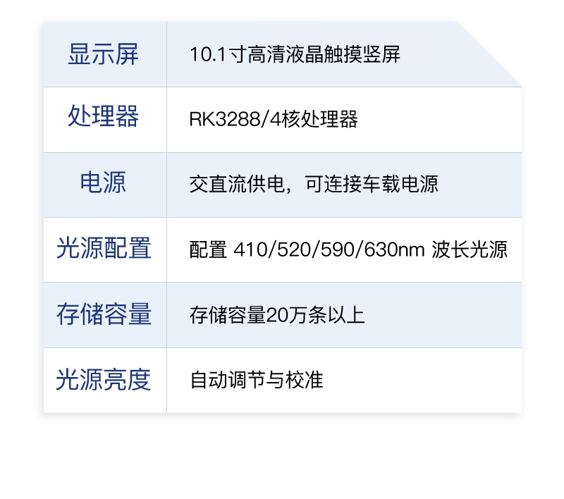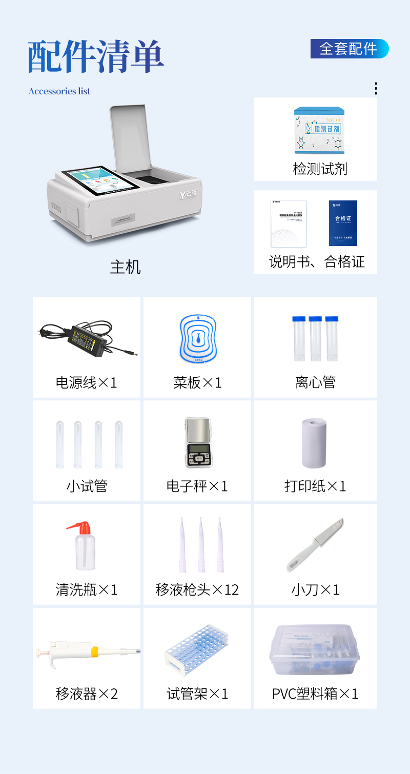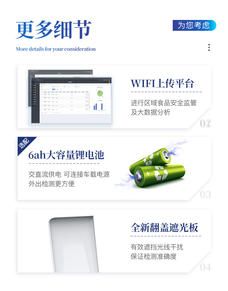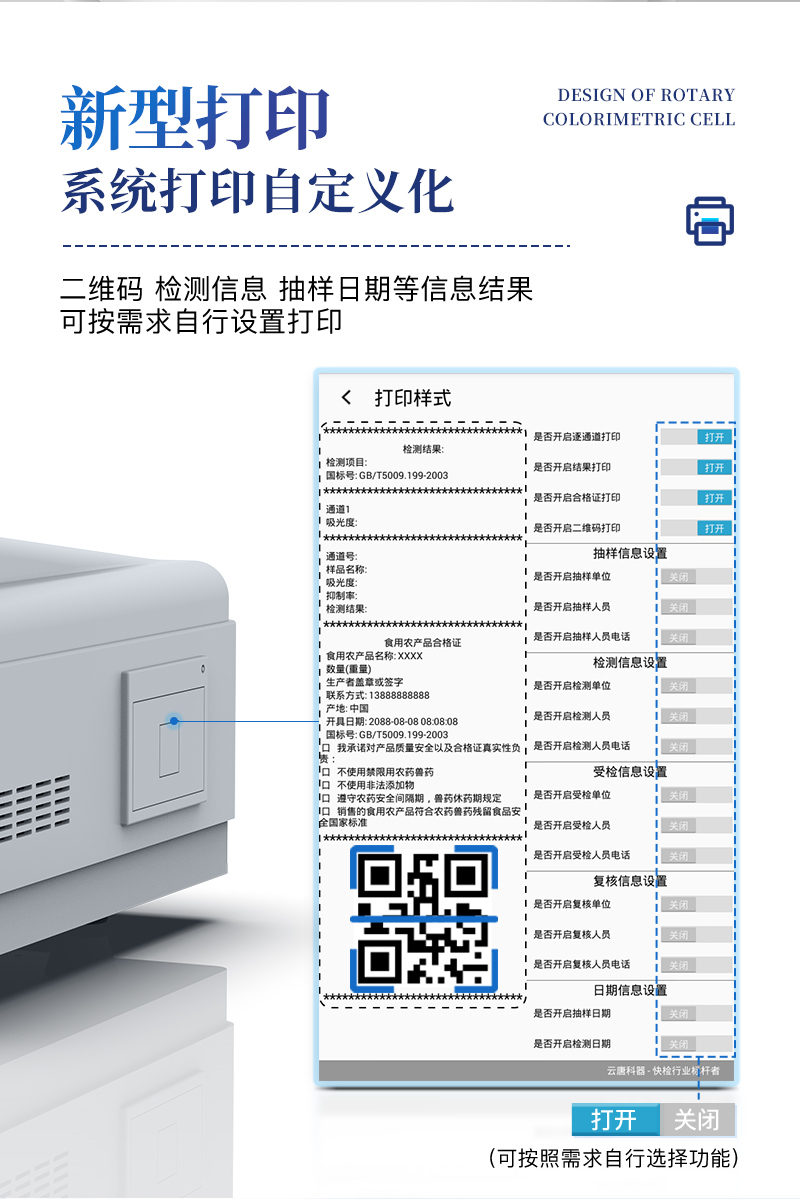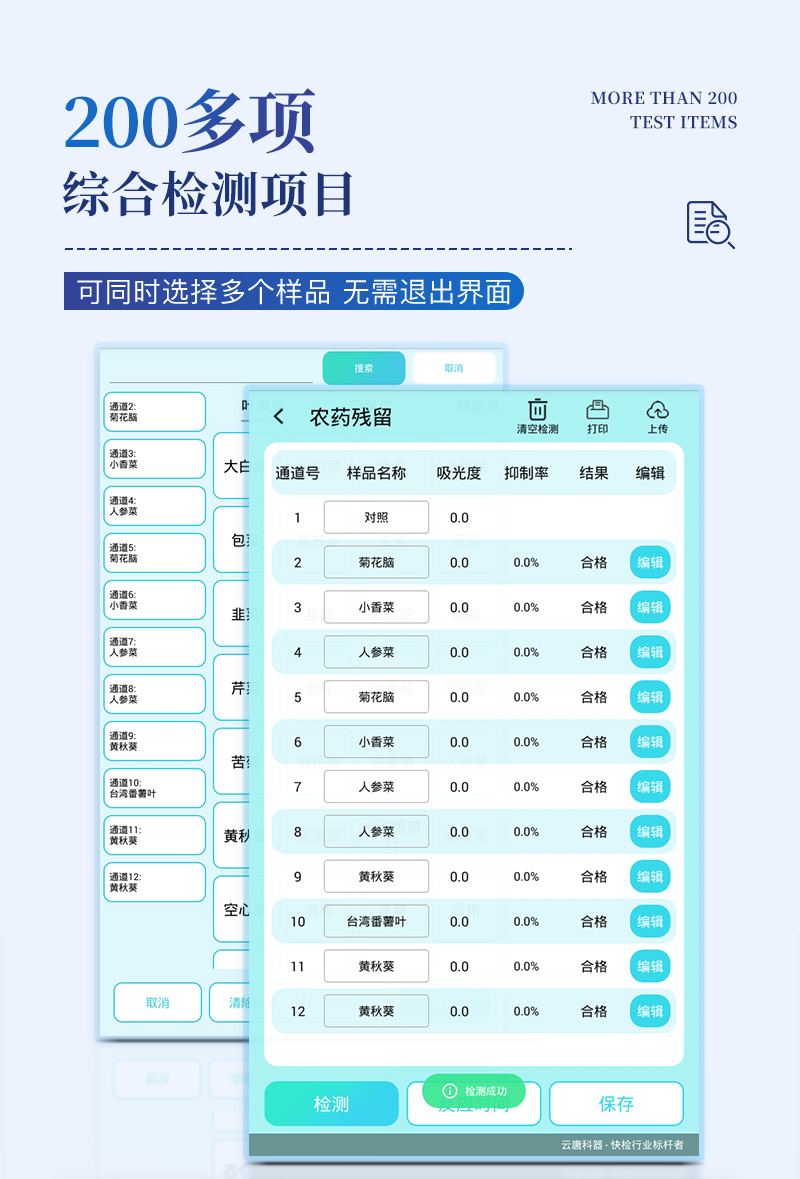 仪器采用台式一体化系统检测技术,将分光光度模块、新型农残检测模块、数字化管理模块、无线通讯模块高度集成于一体,支持检测200种食品安全检测项目,同时预留升级检测方法。 | 仪器检测模块标准化、智能化,可随意自由组合。检测箱体内置多个标准检测单元,检测模块可以调整配置。 | 仪器采用全新安卓智能系统,主控芯片采用 ARM Cortex-A7,RK3288/4核处理器,10.1寸高清液晶触摸竖屏,更加**的UI交互界面,运转快捷;仪器配备无线通信模块: 4G(APN)通讯模块、Wifi模块,蓝牙传输,同时具有双USB接口以及RJ45接口能以多种方式实现数据保存和数据传输功能。 | 创新检测模式: | ★检测通道:≥12通道;采用精密旋转比色池设计,使用同芯片同光源校准精度,解决不同光源之间的误差值。1-12通道间误差0.1%。(***:ZL202022821055.2) | ★仪器具有自动识别比色皿检测功能,即:将样品比色皿放入仪器后,点击样品检测,仪器自动识别比色皿进行通道检测。 | 进口高精光源: | 高精度进口四波长冷光源,通道配置 410、520、590、630nm 波长光源,一个光源芯片驱动一个光源,误差极小,每台设备单独**校准光源,**比对,同时参照四种不同波段光源全方位覆盖市面上99%的农残食品项目检测。 | 智能化操作系统: | 便捷操作系统:设备检测时可在同一检测界面自动对应相关检测通道一次性选择1-12个样品名称,无须退出界面,节省操作时间。 | 数据集成系统:设备首页自动统计检测数据包含:周检测数据、月检测数据,全部检测总数量,均包含检测总数,合格数,不合格数,以及相关柱形分析图,对各项检测数据清晰掌握,无需电脑查询,更加快捷直观。 | 项目预设系统:支持添加单个及多个相同或不相同的任务预设,一键快速调取,每一个任务分别可以设置不同的样品、批次、编号、来源、备注、抽样信息、检测信息、受检信息、复核信息等更多信息。无缝链接平台和APP实时查看下发任务。 | 数据监管系统:同步对接监管平台,数据可局域网和互联网数据上传,检测结果可选择直接传至食品安全监管平台。集成OSS输出存储服务、区分设备定向管理应用,进行区域食品安全监管及大数据分析处理与数据统计,检测区域食品安全长短期动态,达到食品安全问题预估、预警。 | 自定义打印系统:内置全新打印系统,新创自定义打印方式,可按需灵活设置开启或关闭:产品合格证(国家农业部标准要求),二维码,抽样信息、检测信息,受检信息、复核信息、抽样日期、检测日期等信息的打印。 | 系统远程更新功能:可定向分客户分仪器更新系统,按照不同客户后期实际需求添加项目,无需机器返厂,即可远程实时升级全新系统,节省时间成本及避免运输造成设备损坏。 | 仪器主机采用一体化防水、抗压、防撞击、防腐蚀箱体设计,同时配备交直流供电,可连接车载电源,可选配大容量充电锂电池,满足现场野外检测需求。 | 安全证书,放心保障:仪器具有中国计量科学研究院校准证书,权威认证。 |