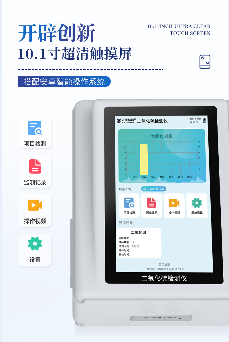 YT-R12二氧化硫检测仪采用比色方法符合《GB/T5009.34—2003食品中亚硫酸盐的测定》二氧化硫检测仪广泛应用于、果脯、糖类、酒类、各类干果、草药、水产品、肉类干鲜品及肉制品中的二氧化硫含量测定。