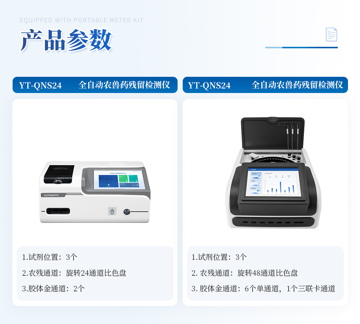 1. 试剂位置:3个 | 2. 农残检测盘:旋转24通道比色盘,可任意选择检测通道,自动对应选择通道。 | 3. 胶体金通道:2个,可读取检测卡结果,自动采集、处理分析,自动判断检测结果,并具备自动判空功能。 | 4.系统配置:10.1寸高清液晶触摸屏,采用ARM Cortex™-A7,RK3288/4核处理器,运行内存1GB。Android7.1.1 系统分辨率1280×800。 | 5.恒温系统:具有自动加温温控系统,精准恒温37℃,精度±0.1℃。 | 6.添加系统:仪器按照试剂要求自动、按时、按量加入试剂,并且自动对未正常放置的样本或异常的样本进行检查并提示。 | 7.清洗功能:仪器具备回流及自动清洗管路功能,避免试剂污染。 | 8.混匀功能:设备具备自动混匀功能。 | 9.光源校准:设备可自动校准,确保检测准确度。 | 10.实时监控:仪器测试过程中屏幕显示运行状态,可实时查看。 | 11.数据存储:内部存储16GB,可存储500万条数据。 | 12.样品多选功能:设备具备样品一键多选功能,选择样品自动匹配检测通道。 | 13.项目预设:可提前设置单个及多个相同或不相同的检测任务,可单次或者多次调取,减少检测时间。 | 14.自定义打印系统:内置自定义打印系统,可按需灵活设置开启或关闭:产品合格证(国家农业部标准),二维码,抽样信息、检测信息,受检信息等信息的打印。 | 15.A4版本报告打印功能:设备可自动生成A4版报告,A4报告带二维码,可扫描二维码生成电子版,并可识别真伪。 | 16.传输方式:仪器配备无线通信模块: 4G(APN)通讯模块、Wifi模块,蓝牙传输模块,同时具有USB接口以及RJ45接口能以多种方式实现数据保存和数据传输功能,设备数据可以同步上传至平台。 | 17.系统17.数据监管系统:设备自带监管平台,并可同步对接监管平台,数据可局域网和互联网数据上传,检测结果可直接传至食品安全监管平台。达到食品安全问题预估、预警。 | 18.系统远程更新功能:无需设备返厂,即可远程实时升级全新系统,节省时间成本及避免运输造成设备损。 |