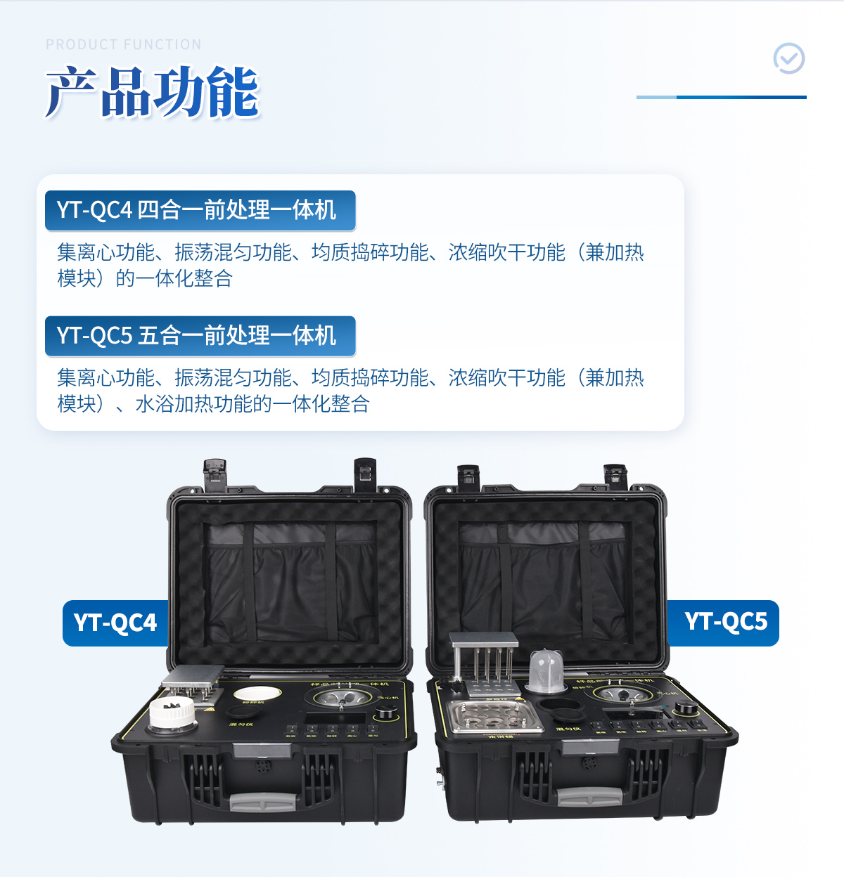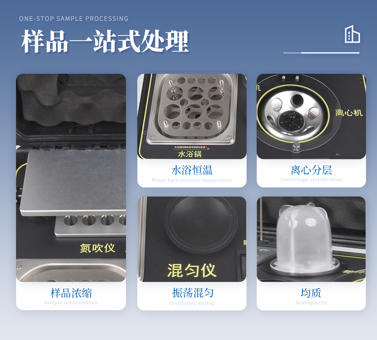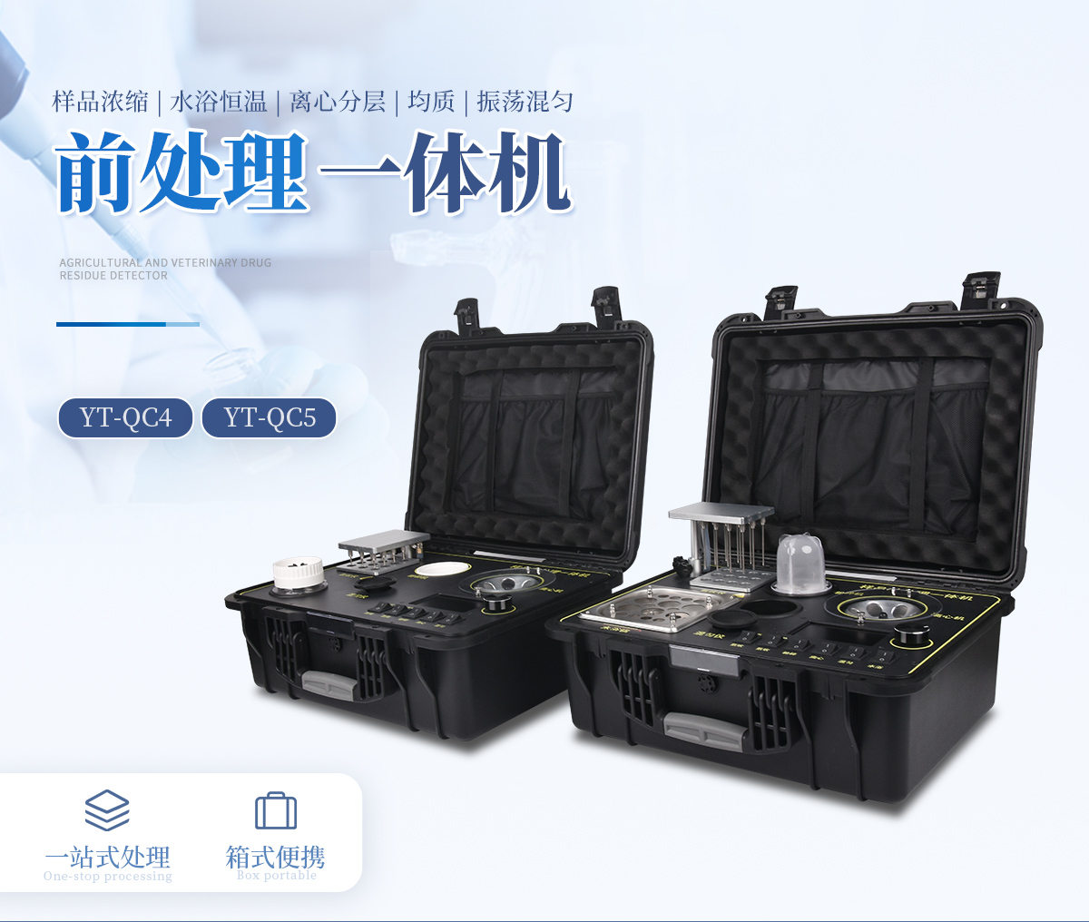 应国内用户的实际需求,自行研制开发的新型仪器——QC05型样品前处理一体机。样品前处理集成箱将样本前处理过程中样品浓缩、水浴恒温、离心分层、均质、振荡混匀等步骤所需设备进行集成,仅需一台样品前处理集成箱设备即可完成所有样本前处理过程,并且方便携带,不仅适用于现场检测使用,还可用于色谱、质谱等分析样品的纯化和制备。