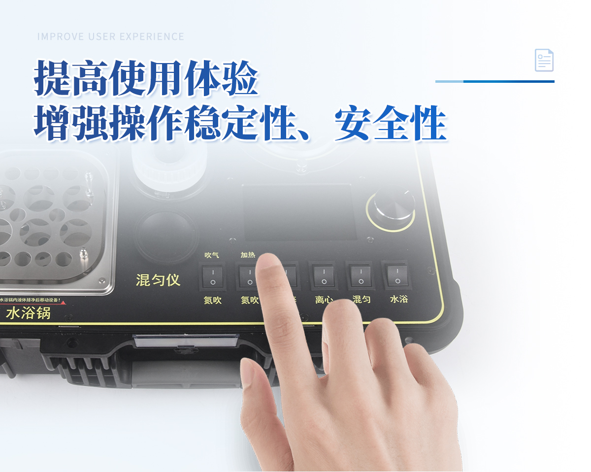 1、功能紧凑,集成五种样品前处理常用的功能,完成样品一站式处理。 | 2、结构稳固,机箱采用***工程塑料,具备**的抗冲击性、耐腐蚀性、便携性。 | 3、操作稳定,机器采用五寸全彩色液晶屏,功能指示性强,用户操作均为实体开关,杜绝佩戴手套和液体喷溅时的操作失效。 |