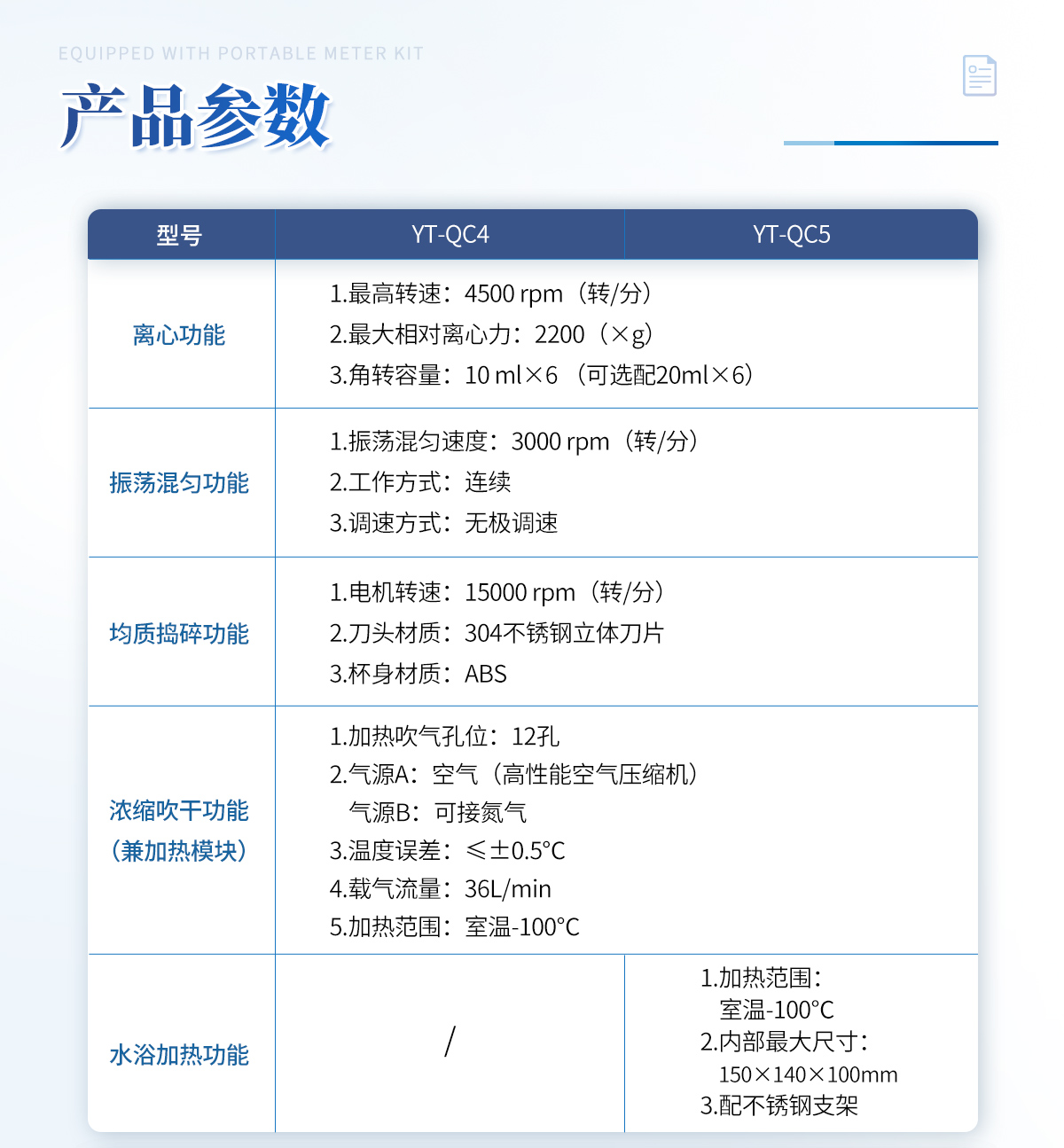 离心功能 1.**转速:4500 rpm(转/分) 2.**相对离心力:2200(×g) 3.角转容量:10 mlx6 (可选配20mlx6) | 振荡混匀功能 1.振荡混匀速度:3000 rpm(转/分) 2.工作方式:连续 3.调速方式:无极调速 | 均质捣碎功能 1.电机转速:15000 rpm(转/分) 2.刀头材质:304不锈钢立体刀片 3.杯身材质:ABS | 浓缩吹干功能(兼加热模块) 1.加热吹气孔位: 12孔 2.气源A: 空气(高性能空气压缩机) 气源B: 可接氮气 3.温度误差:≤±0.5℃ 4.载气流量:36L/min 5.加热范围:室温-100℃ | 水浴加热 1.加热范围:室温-100℃ 2.内部**尺寸:150mmX140mmX100mm 3.配不锈钢支架 |