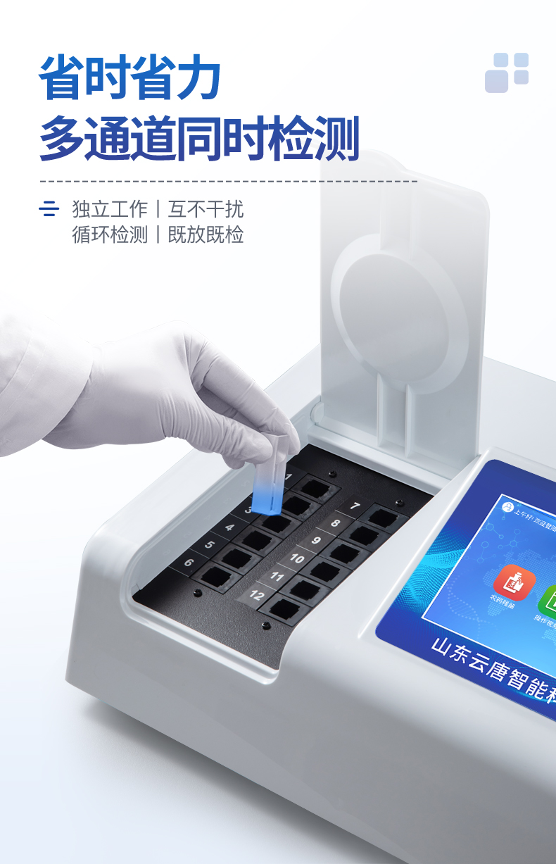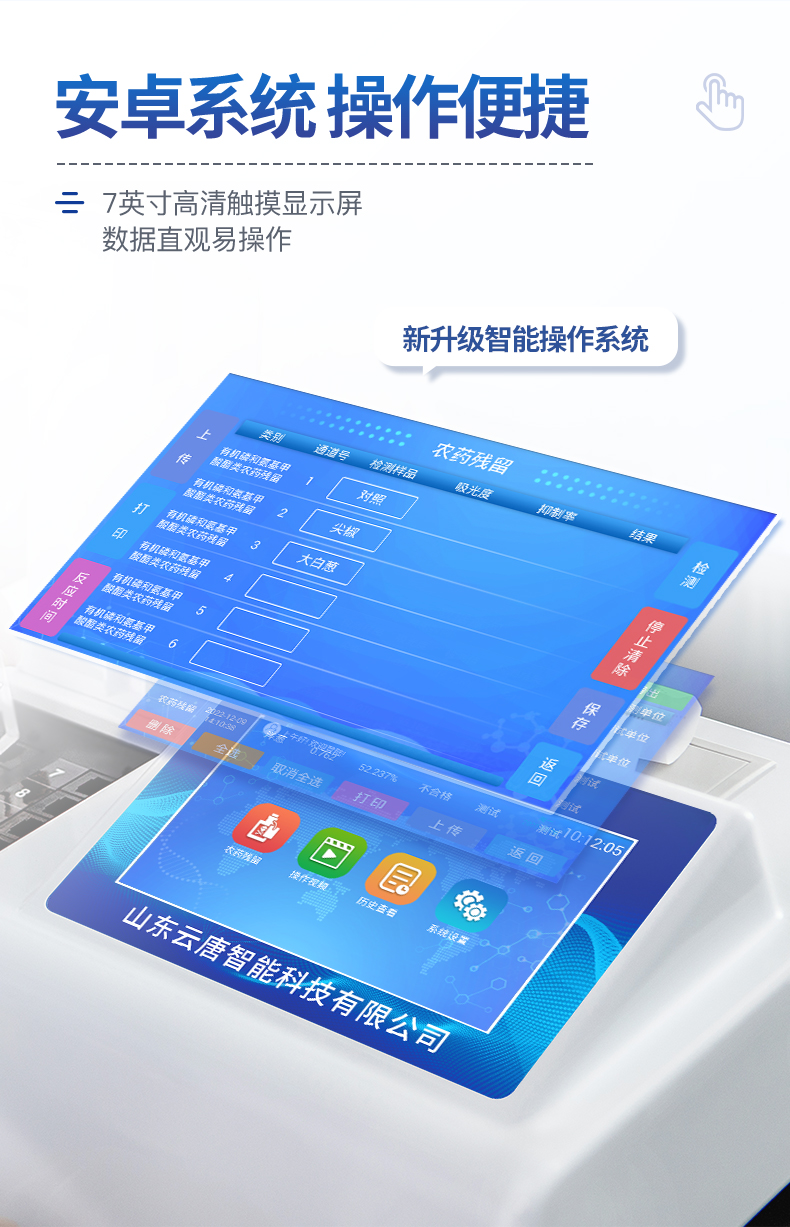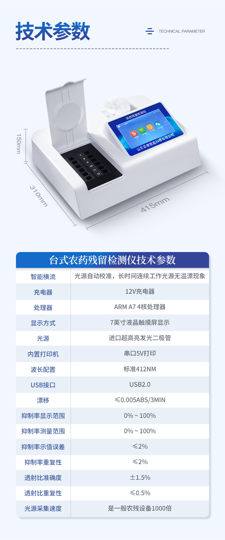 乙酰胆碱酯酶和丁酰胆碱酯酶试剂均可以使用,符合****和农业部标准的要求。 | 自动判断样品是否合格,检测结果更加直观。 | 仪器具有100多种蔬菜名称菜单库,分类管理,并可按需添加或删除蔬菜名,编辑蔬菜名称,可直接打印出蔬菜名称。 | 检测通道:10个检测通道,可以同时测试多个样品,循环检测,即放即检,每个样品由程序控制分别独立工作,不会互相干扰。 | 智能操作系统,采用更加人性化操作,主控采用多核处理器,主频1.88Ghz,运转速度更快速,稳定性更强。 | 显示方式:7英寸高灵敏真彩触摸屏显示,人性化中文操作界面,读数直观、简单。 | 打印机采用串口5v打印,可选择手动打印或者自动打印,三分钟出打印结果,打印格式为检测人姓名、吸光度差值、检测时间、检测机构、样品名称及结果判定。 | 光源采用进口超高亮发光二极管,具有低功耗、高精度、稳定性强、光源可控可以关掉不使用的光源,响应速度快等优点。 | 智能恒流稳压,光强自动校准,长时间连续工作光源无温漂现象。 | 仪器具有GPRS远传功能,可插手机卡实现数据远传平台,wifi联网功能,可将数据快速上传电脑,进行数据管理与统计。 | 采用USB2.0接口设计,方便数据的存贮和移动,并可随时与计算机直接相连,并且可用计算机控制仪器。实现数据查询、浏览、分析、统计、打印等。 | 智能化程度高,仪器具有自检功能:具有开机自检和调零功能,具有自动检测重复性功能 | 仪器具有自身保护功能,可设置用户名及密码,防止非工作人员操作等。 | 采用DC12v直流供电,安全系统更高,并且配备6A锂电池充电器。 | 仪器具有重新校准、锁定、恢复出厂设置功能。 |