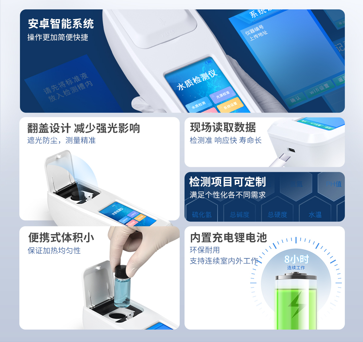 本仪器采用光电比色原理取代传统的目视比色法。消除了人为误差,因此测量分辨率大大提高。测量时,把被测水样放入光电比色池,仪表会直接读取数据。