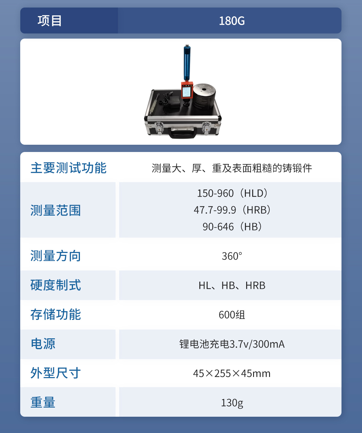 标准配置 | 主机、支撑环,HRC标准硬度块、充电器、尼龙刷 |