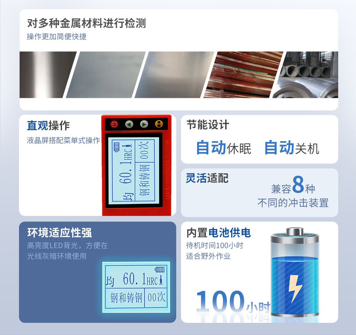 ● 依据里氏硬度测量原理,可以对多种金属材料进行检测,测值准确稳定;