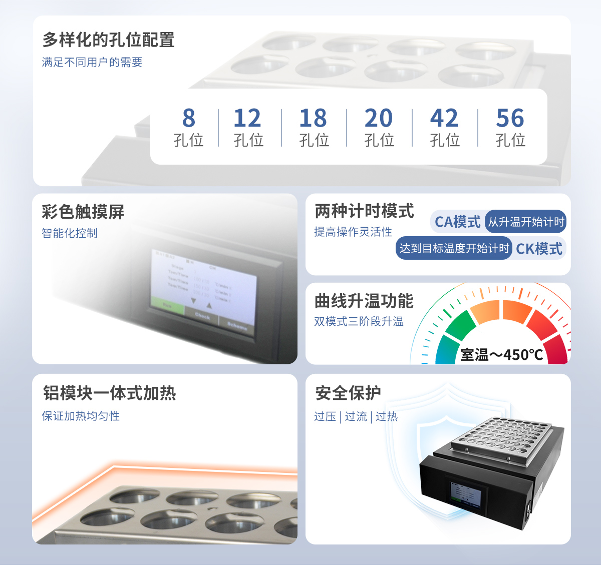 3. ☆智能化控制、时间控制、曲线升温功能(双模式三阶段升温)。双模式分别为:CA模式:从升温开始计时,CK模式:达到目标温度开始计时。