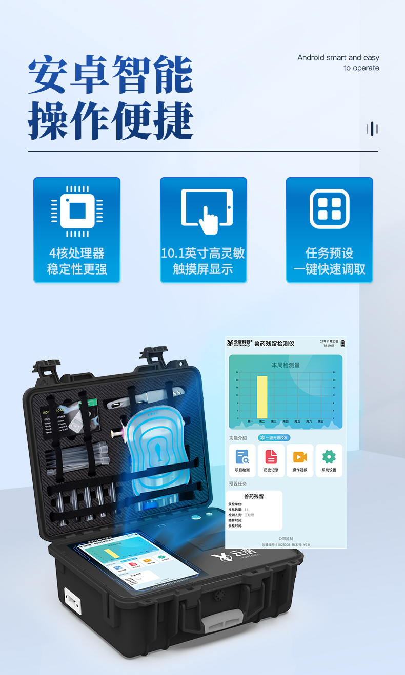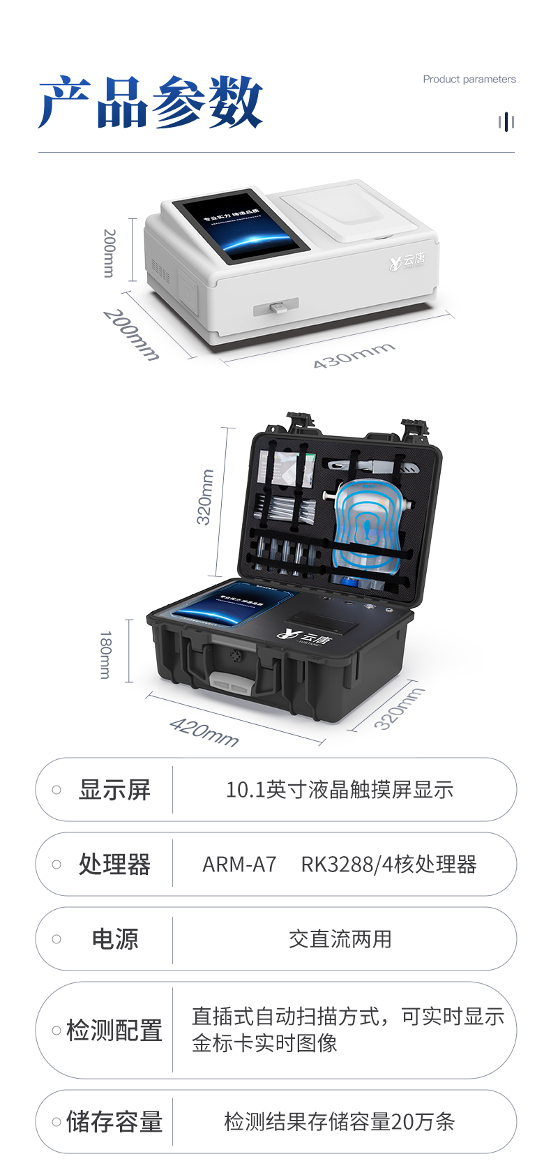 仪器采用台式一体化系统检测技术,将分光光度模块、数字化管理模块、无线通讯模块高度集成于一体,可支持检测60种食品安全检测项目,同时预留升级检测方法。 | 仪器检测模块标准化、智能化,检测项目可随意自由组合。检测箱体内置多个标准检测单元,检测模块可以调整配置。 | 显示屏幕:仪器采用10.1英寸竖向液晶触摸屏显,搭配运行安卓智能操作系统,主控芯片采用ARM Cortex-A7,RK3288/4核处理器,主频1.88Ghz,操作方便,性能更强。 | 检测通道:≥12通道;采用精密旋转比色池设计,使用同芯片同光源校准精度,解决不同光源之间的误差值,更加准确**。(1-12通道间误差0.1%,***:ZL202022821055.2) | 仪器光源:高精度进口四波长冷光源,每个通道均配置 410、520、590、630nm 波长光源,标配**的光路切换装置,专利光路切换功能可实现64波长,并且所有检测项目可实现所有通道同时检测。 | 设备可一键校准,自动保存校准数据,自动对比校验,得到精准光源,采用Android SP存储数据,光源数据永不丢失,方便每一次使用。 | 通讯接口:配备无线通信模块、4G(APN)通讯模块、蓝牙传输,同时具有双USB接口以及RJ45网线接口,可以多方式实现数据保存及数据传输。 | 存储方式:支持U盘存储,标准USB接口,免驱动安装。检测结果存储容量20万条以上,可生成Excel表格进行拷贝,并具有登录保护功能。 | 智能化操作系统: | 1、操作系统:仪器可在同一检测界面自动对应相关检测通道,一次性选择1-12个样品名称,无需退出界面,节省操作时间。并可以对每个通道属性和样品信息单独进行编辑,例如送检单位、人员,检测人员等,打印时勾选打印显示。 | 2、数据集成系统:设备首页自动汇总分析检测数据,包含:周检测数据、月检测数据,全部检测总数量,均包含检测总数,合格数,不合格数,以及相关柱形分析图,各项检测数据一目了然,无需电脑查询,更加快捷直观。 | 3、数据库系统:十几项数据库分类管理仪器:包含项目类型、项目数据、检测数据、历史记录、国标信息、曲线信息、采样信息、检测信息、受检信息、复核信息、图表信息、光源校准信息、打印样式信息、样品库信息等等,数据库之间互相协调联动保证数据的真实完整性。同时产品数据库以及历史检测记录支持一键检索功能。 | 4、限量规判系统:具有限量查询、添加物质合规判定系统。检测出结果后,系统自动调用系统数据库中相关国标进行比对判定,客观显示判定结果是否合格。 | 5、项目预设系统:仪器具有任务预设模块,一键提前预设,给出方便快捷的新检测方案,每一个任务分别可以设置不同的样品、批次、编号、来源、备注、抽样信息、检测信息、受检信息、复核信息等更多信息。样品送检时一键调取保存信息,并可多次调取,大大提高检测效率。 | 6、数据监管系统:同步对接监管平台,数据可局域网和互联网数据上传,检测结果可选择直接传至食品安全监管平台。进行区域食品安全监管及大数据分析处理与数据统计,检测区域食品安全长短期动态,达到食品安全问题预估、预警。 | 7.1、全新打印系统:内置全新打印机,新创自定义打印方式,可按需灵活勾选控制:二维码,抽样信息、检测信息,受检信息、复核信息、抽样日期、检测日期等信息的打印。 | 7.2、A4纸版本报告打印功能(可选配):设备拥有两种结果展示方式,可以自动生成A4打印模板和小票打印模板两种样式,可通过WiFi及网线等方式链接外置打印机可进行打印。 | 供电模式:仪器交直流两用,直流12V供电,可连接车载电源,可配6ah大容量充电锂电池,电量可实时显示,方便户外流动测试。 | 仪器具备远程升级功能,可定向分客户分仪器更新,开机后自动更新,并可持续性免费更新系统版本,无需像传统产品返厂更新,节省时间及人力成本并避免了物流运输返厂升级导致设备损坏的潜在风险。 |