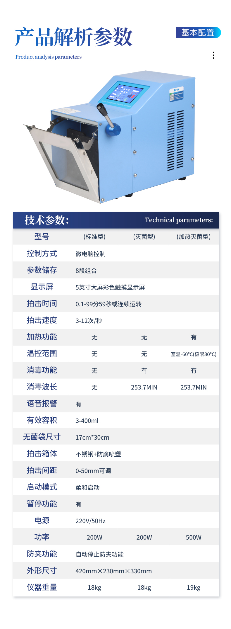 ●5英寸液晶显示屏。 ●可储存三组工作程序。 ●可调整的均质时间。 ●均质速度可调节或固定。 ●拍击器可调整前后距离。 ●无菌一次性滤袋,保证卫生。 ●全开启式门,易于清洗。 ●玻璃透明窗口易于观察 。 ●样品与均质仪无接触,如无样品泄露则不需进行系统清洗. ●均质柔和、样品零污染、无损伤、不升温、不需要灭菌处理,不需洗刷器皿。