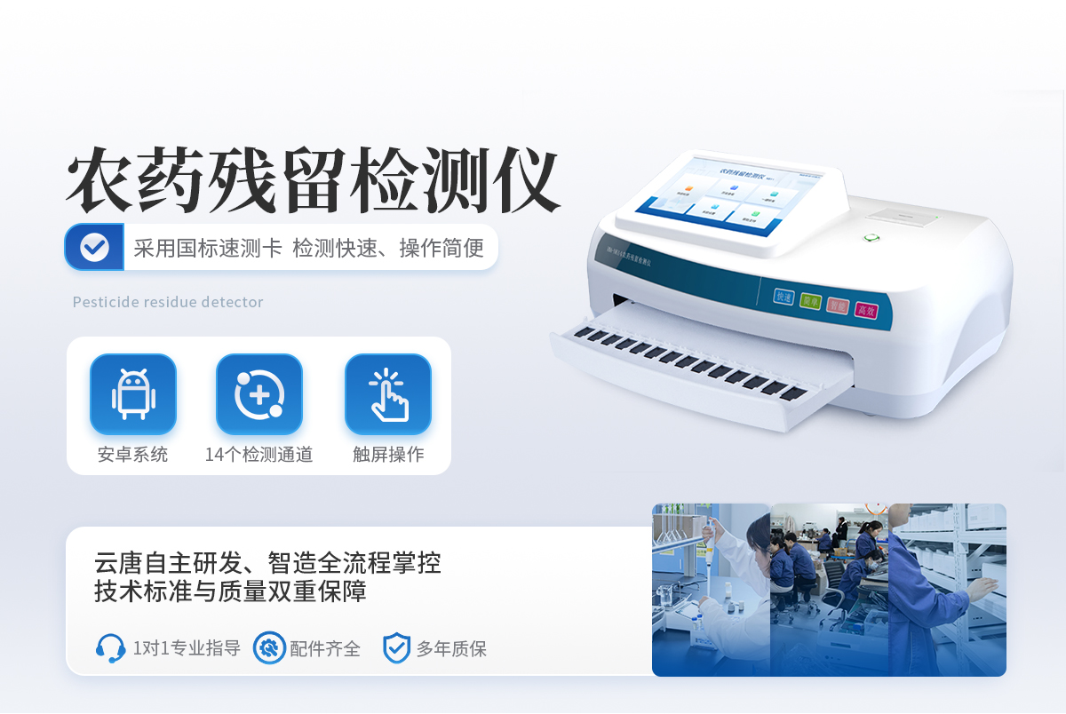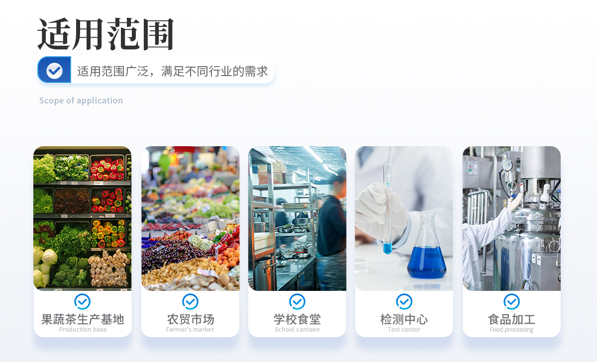 采用酶抑制率比色法对蔬菜、水果、茶叶、粮食、农副产品等食品中有机磷和氨基甲酸酯类农药残留含量进行快速准确的检测;广泛应用于果蔬茶生产基地和农贸批发销售市场现场检测、农业部门、学校食堂、市场监管局、检测中心等的安全速测。