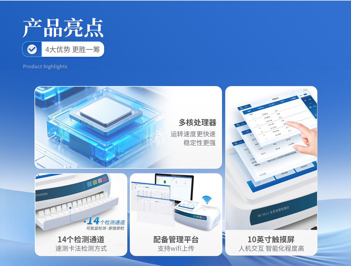 1、★采用速测卡法,省却冗杂的步骤,提高检测体验和效率 2、安卓智能系统7.1版本,操作更加流畅,使用更方便。 3、★10英寸高灵敏真彩触摸屏显示,交互性用户体验更好。 4、★具有14个检测卡通道,可更多的批量测试样品,即放即检,检测效率更高。 5、支持wifi、蓝牙传输,数据可无线上传;支持U盘拷贝数据,免驱动插拔。 6、配置食品安全管理平台,检测结果可长期存储,进行长短期查看分析,辅助管理。 7、仪器具有分类管理蔬菜名称菜单库,并可按需编辑蔬菜名称、检测单位等信息。 8、内置热敏打印机,可选择性打印详细的检测信息。 9、★检测过程中检测仓自动弹出,自动关闭。 10、主控采用多核处理器,主频1.88Ghz,运转速度更快速,稳定性更强。