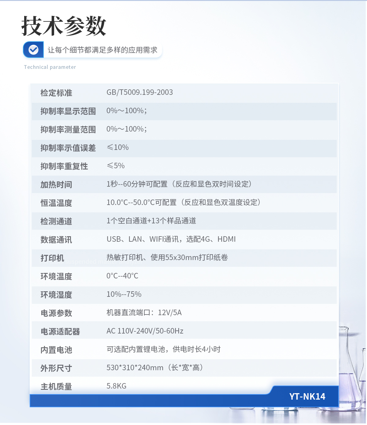 检定标准:GB/T5009.199-2003 抑制率显示范围:0%~100%; 抑制率测量范围:0%~100%; 抑制率示值误差:≤10% 抑制率重复性:≤5% 加热时间:1秒--60分钟可配置(反应和显色双时间设定) 恒温温度:10.0℃--50.0℃可配置(反应和显色双温度设定) 检测通道:1个空白通道+13个样品通道 数据通讯:USB、LAN、WIFI通讯,选配4G、HDMI 打印机:热敏打印机、使用55x30mm打印纸卷 环境温度:0℃--40℃ 环境湿度:10%--75% 电源参数:机器直流端口:12V/5A 电源适配器:AC 110V-240V/50-60Hz 内置电池:可选配内置锂电池,供电时长4小时 外形尺寸:530*310*240mm(长*宽*高) 主机质量:5.8KG