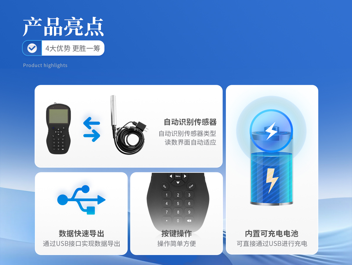 Ø 主机具有IP67防护等级; Ø 3.5寸彩屏显示,界面菜单设计美观,操作简单方便; Ø 人体工程学曲线设计,适于手握握持,带有橡胶防滑手带,在潮湿环境中不易滑落; Ø 具有数据存储功能,且可通过USB接口实现数据导出; Ø 内置可充电电池,且直接通过USB进行充电,无需拆卸电池; Ø 自动识别连接的传感器类型,读数界面自动适应; Ø 可对传感器进行参数设置和校准;