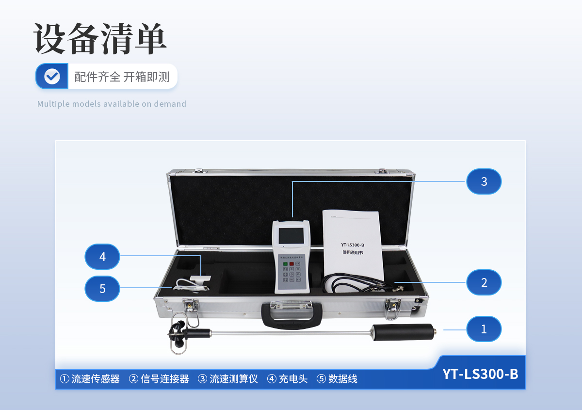 ①流速传感器、②信号连接器、③流速测算仪、④充电头、⑤数据线