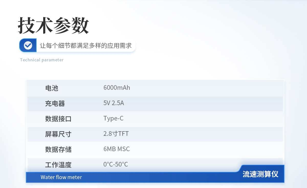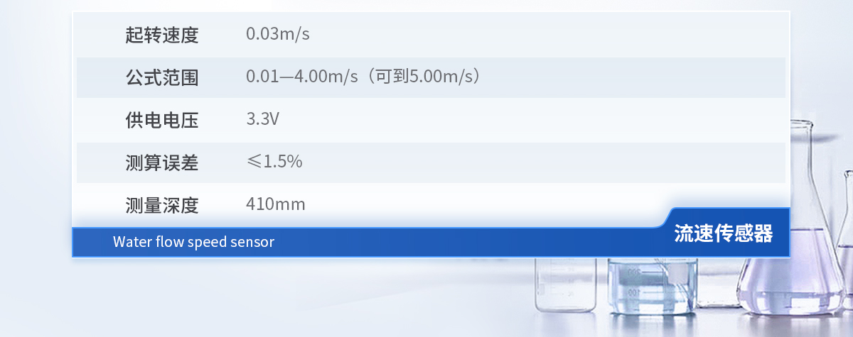起转速度 :0.03m/s 公式范围 :0.01—4.00m/s(可到5.00m/s) 供电电压:3.3V 测算误差 :≤1.5% 测量深度 :410mm