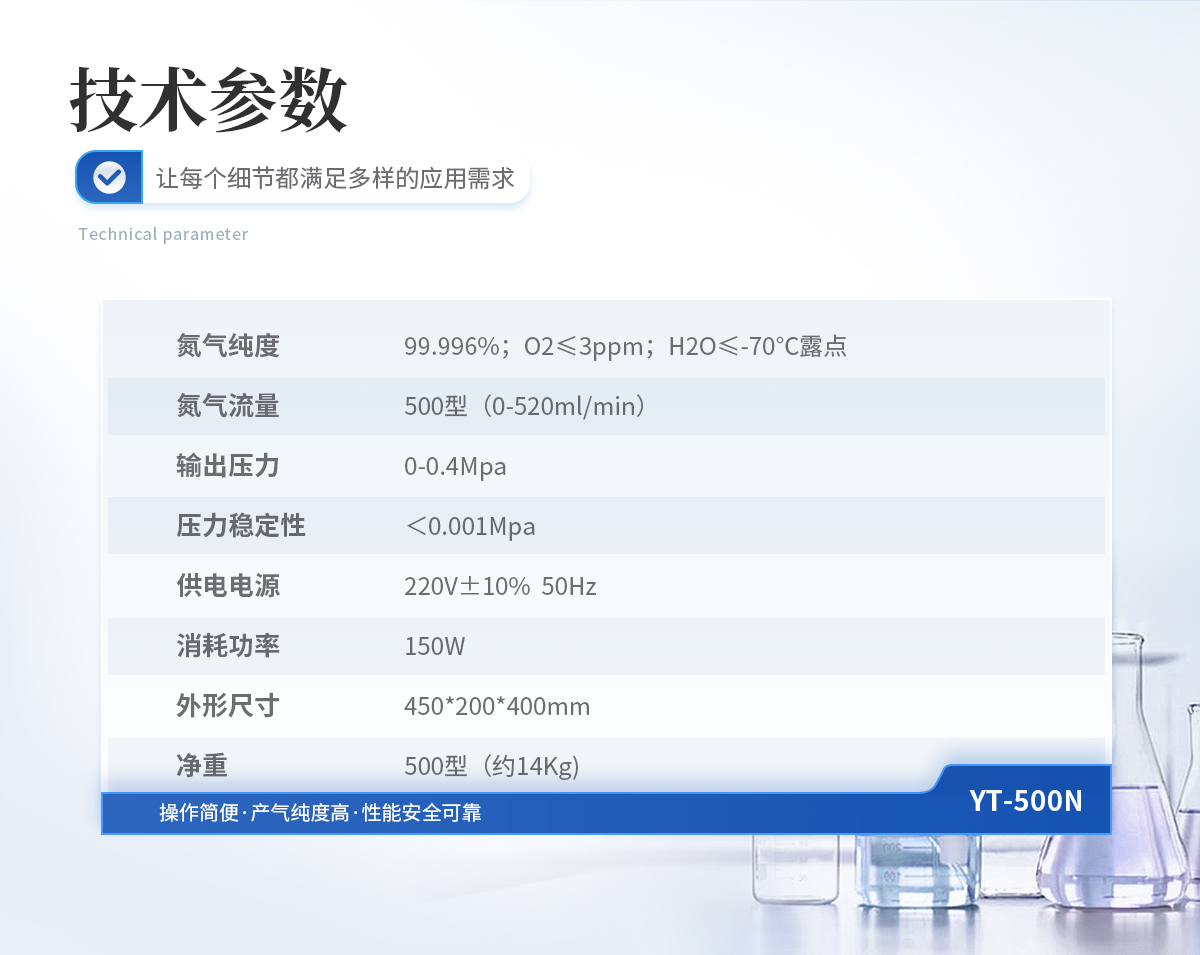 1、氮气纯度: 99.996%;O2≤3ppm;H2O≤-70℃露点 2、氮气流量: 500型(0-520ml/min) 3、输出压力: 0-0.4Mpa 4、压力稳定性:<0.001Mpa 5、供电电源: 220V±10% 50Hz 6、消耗功率: 150W 7、外形尺寸: 450*200*400mm 8、净重: 500型(约14Kg)