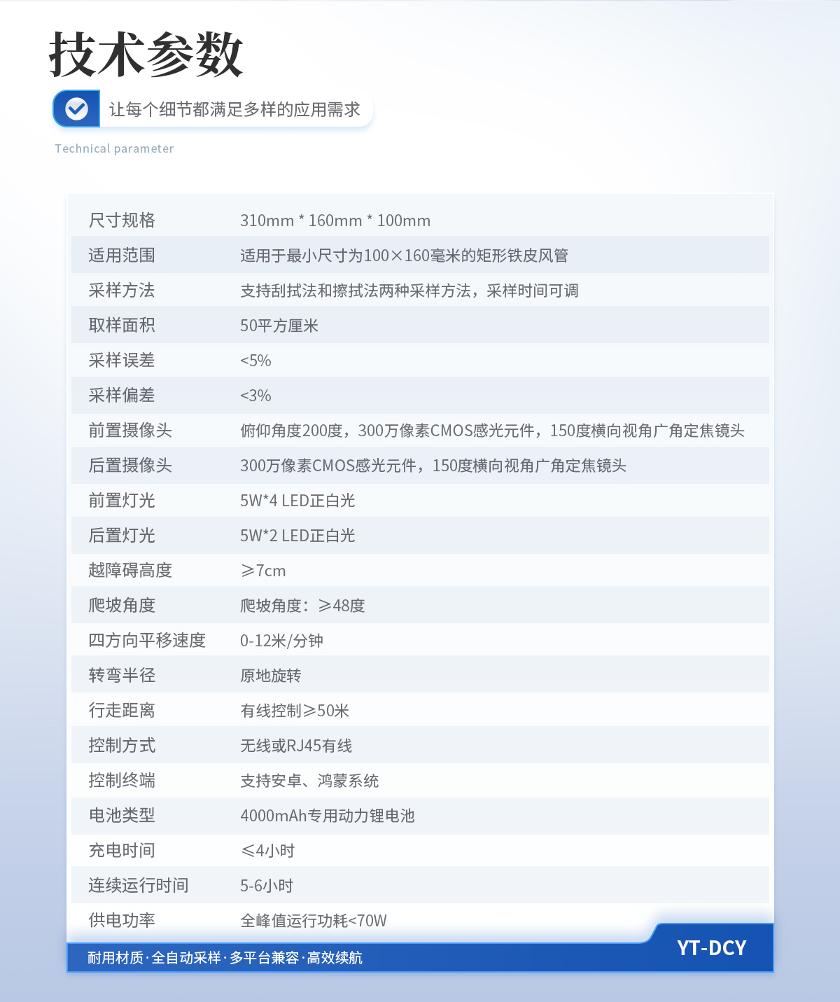 尺寸规格:310mm * 160mm * 100mm; 适用范围:适用于*小尺寸为100×160毫米的矩形铁皮风管; 采样方法:支持刮拭法和擦拭法两种采样方法,采样时间可调; 取样面积:50平方厘米; 采样误差:<5%; 采样偏差:<3%; 前置摄像头:俯仰角度200度,300万像素CMOS感光元件,150度横向视角广角定焦镜头; 后置摄像头:300万像素CMOS感光元件,150度横向视角广角定焦镜头; 前置灯光:5W*4 LED正白光; 后置灯光:5W*2 LED正白光; 越障碍高度:≥7cm; 爬坡角度:≥48度; 四方向平移速度:0-12米/分钟; 转弯半径:原地旋转; 行走距离:有线控制≥50米; 控制方式:无线或RJ45有线; 控制终端:支持安卓、鸿蒙系统; 电池类型:4000mAh专用动力锂电池; 充电时间:≤4小时; 连续运行时间:5-6小时; 供电功率:全峰值运行功耗<70W;
