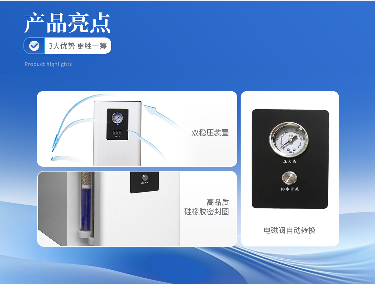 1、双稳压装置,确保高精度稳压条件下气体流量的稳定性。 2、电磁阀自动转换,彻底杜绝了电磁阀在自动放水时产生的连续噪音,实现放水、转换一体化。 3、仪器内部采用硅橡胶圈,含硫量低有效提高气体质量,保证色谱基线稳定。 4、体积小,双支FV型亚克力过滤器,耐压高,不会因工作环境及腐蚀气体的影响,导致过滤管变形,开裂而产生漏气现象,可持久使用,一劳永逸。
