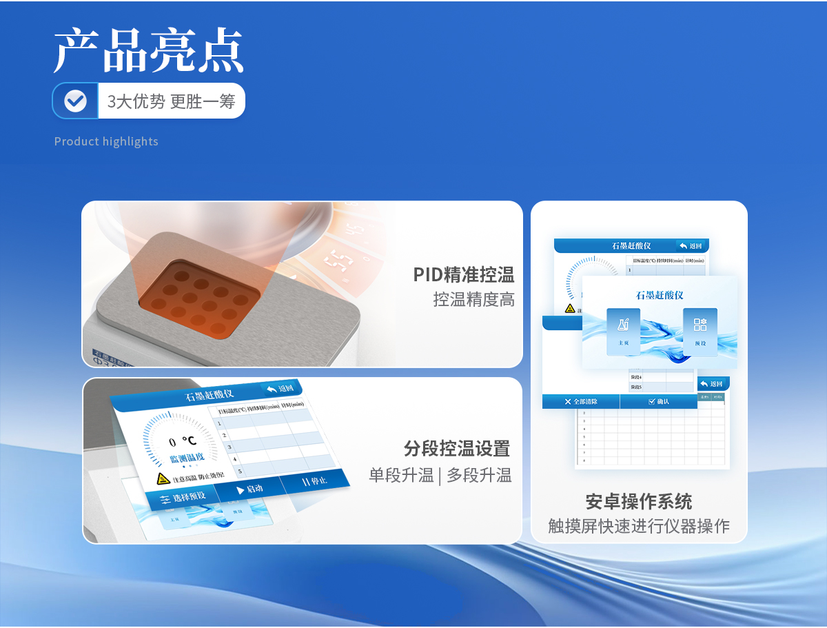 使用5寸彩色触摸屏进行仪器操作,配备安卓操作系统,方便快捷。 采用PID 控温技术,控温精度高,升温速度快, 从室温到260℃仅需25分钟。 分段控温设置,即可单段升温,也可多段升温,设置灵活,仪器将自动按顺序完成。更适于易产生泡沫的样品。 采用优质石墨炉内芯,平均温差较小,样品效果一致性好,热传导效率更高。石墨块具有特氟龙涂层,耐腐蚀,延长使用寿命。