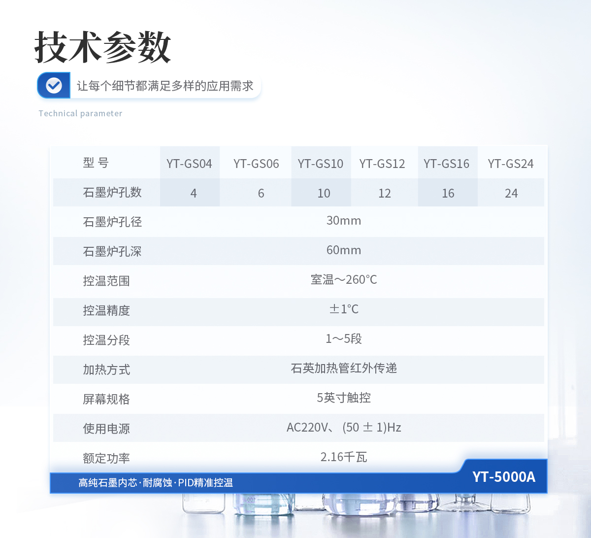 石墨炉孔:孔径30mm,孔深60mm,孔数5×2 控温范围:室温~260℃ 控温精度:±1℃ 控温分段:1~5段 加热方式:石英加热管红外传递 屏幕规格:5寸触控 主机外型尺寸:宽522mm×深371mm×高168mm 使用电源:AC220V、 (50 ± 1)Hz 额定功率:1.6千瓦
