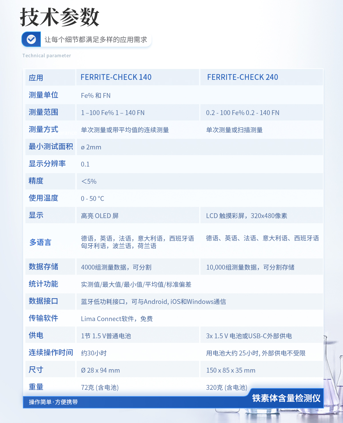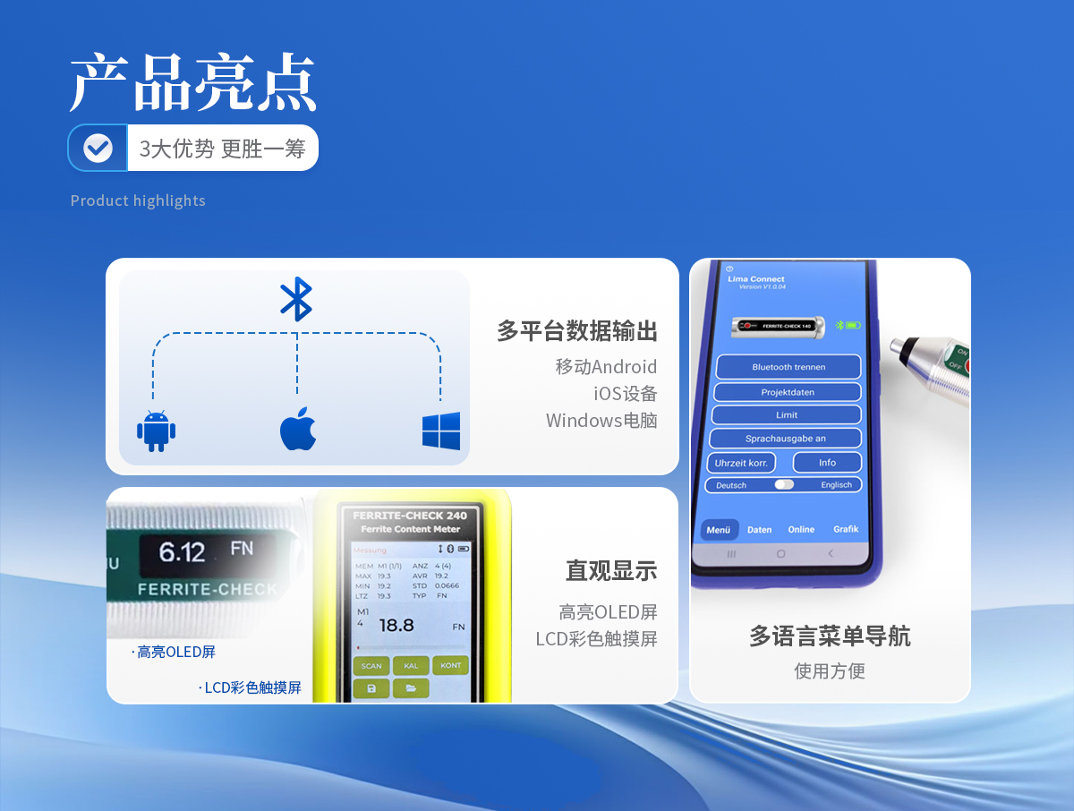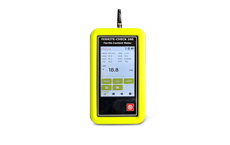 FERRITE-CHECK 240铁素体含量检测仪采用分体式的设计,使用方便,仪器符合Basel标准DIN EN ISO 8249,使用磁感应法测量奥氏体钢和双相钢中的铁素体含量。 全新测头
