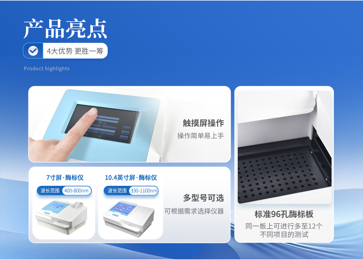 *10.4英寸彩色液晶触摸屏输入,大屏显示,操作快捷; | *全屏显示96孔可视化布板操作界面; | 自动储存标准曲线,用户可对标准曲线进行修正; | 内置嵌入式系统,无需外接电脑即可操作、存储、打印; | 单波长和双波长测试模式下均可进行自动调零; | 可选配外接PC软件,网络化支持,迎合数字化发展方向,可定制上传; | *海量存在,至少可储存100万板(96)测试数据及500个编程项目,并支持数据备份恢复合并; | *在同一板上可进行24个不同项目并可用显示区分的测试,并可同一板检测定性和定量项目; | *模板功能,固定检测工作,极大简化操作人员工作量; | 智能计算测试结果,确保测试结果的准确有效,并可自动报警; | 全新Windows彩色图形化界面,全中文操作系统,支持鼠标、键盘,支持多种输入法; | 光源智能开关,延长其寿命; | *全面完善的质控功能,包含westguard多规则质控,即刻法质控等多种质控图及质控参数计算,具有质控报警功能; | 提供多种打印方式及多种形式中文报告,并可定制各式报告; | *布板和保存导入功能,大幅提高常用项目的测试效率; | *可选择吸光度、Cut-Off定性计算、单点定标、折线回归、线性回归、指数回归、对数回归、双对数回归、log-logit、幂回归、四参数回归、酶抑制率等计算方法; | 专用系统维护菜单,自动判断仪器当前状态及性能指标,并可打印相关数据; |