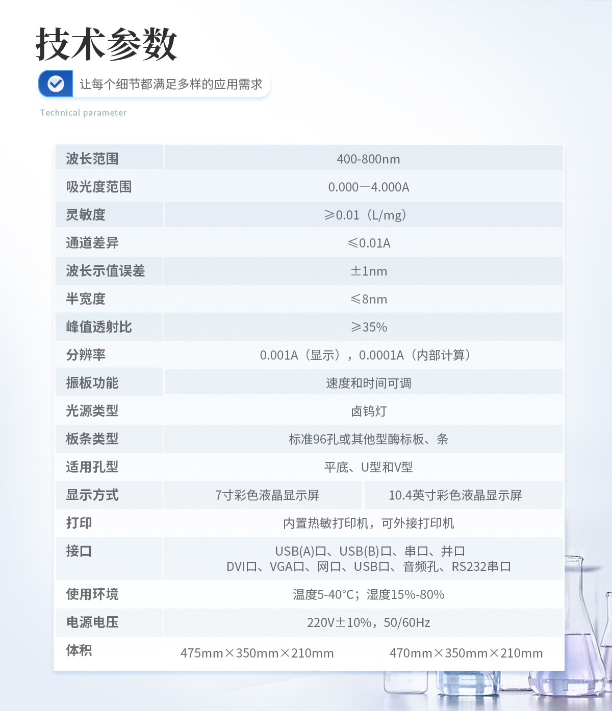 波长范围: 400-800nm | *滤光片配置:10个滤光片位置,标配405nm、450nm、492nm、630nm,选配6定制波长 | 吸光度范围:0.000―4.000A | *光通道数:8通道光路检测,另设一个独立参比通道 | *示值稳定性:≤±0.002A或≤0.5%T/10min。 | *示值误差(准确性):≤±0.005A或±0.2%T | *重复性:≤0.2%或≤0.2%T。 | 灵敏度:≥0.01(L/mg)。 | 通道差异:≤0.01A。 | 波长示值误差:±1nm | 半宽度:≤8nm | 峰值透射比:≥35% | 分辨率:0.001A(显示),0.0001A(内部计算) | *读板速度:单波长≤3秒/96孔,双波长≤6秒/96孔 | 振板功能:速度和时间可调 | 光源类型:卤钨灯 | 板条类型:标准96孔或其他型酶标板、条 | 适用孔型:平底、U型和V型 | *显示方式:10.4英寸彩色液晶显示屏显示 | 输入方式:触摸屏输入,可选配鼠标和键盘 | 打印:内置热敏打印机,可外接打印机 | 接 口:DVI口、VGA口、网口、USB口、音频孔、RS232串口 | 使用环境:温度5-40℃;湿度15%-80% | 电源电压:220V±10%,50/60Hz | 体积:470mm×350mm×210mm(长×宽×高) | 重量:11.5Kg |