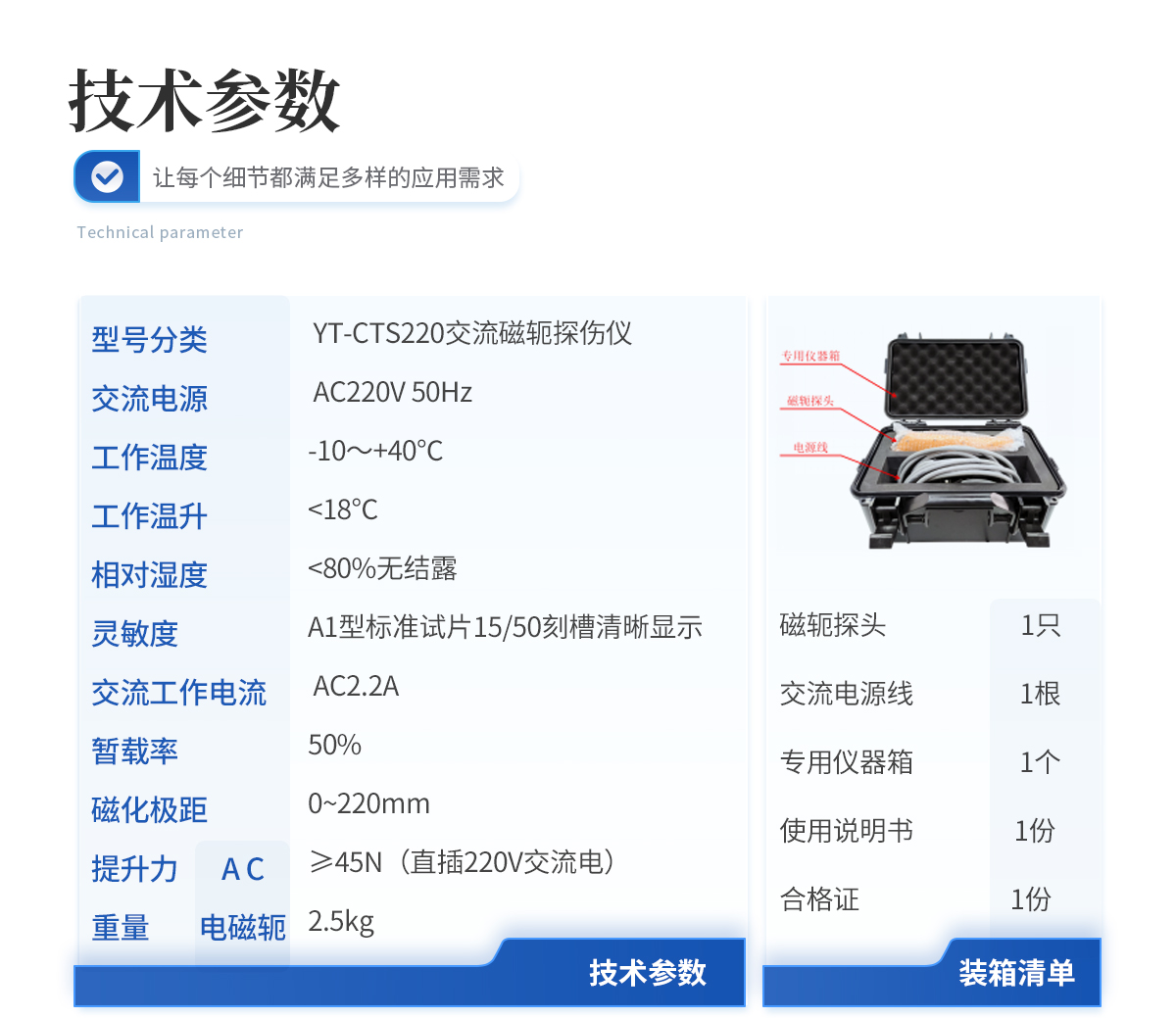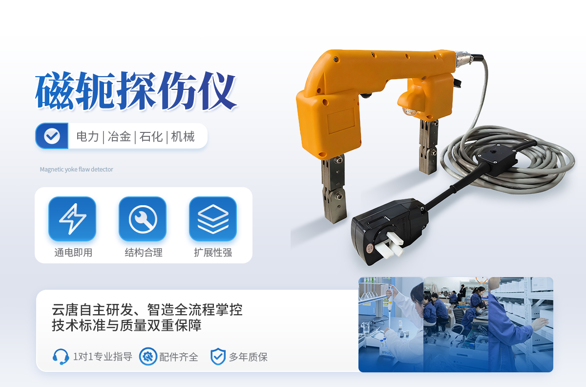 YT-CTS220交流磁轭探伤仪 ,无主机设计,操作简单方便,噪音小、重量小、适用性强,工作稳定。适用于电力、冶金、石化、机械等行业各类钢铁结构件,锅炉、压力容器、压力管道及各类型焊接结构的铁磁性材料表层及近表层缺陷的磁粉探伤。该探伤仪可以直接连接交流电使用,也可以选配交流磁化电源和直流磁化电源使用,**轻便。特别适用于船体焊缝检测、高空钢结构焊缝检测及压力容器内部作业。