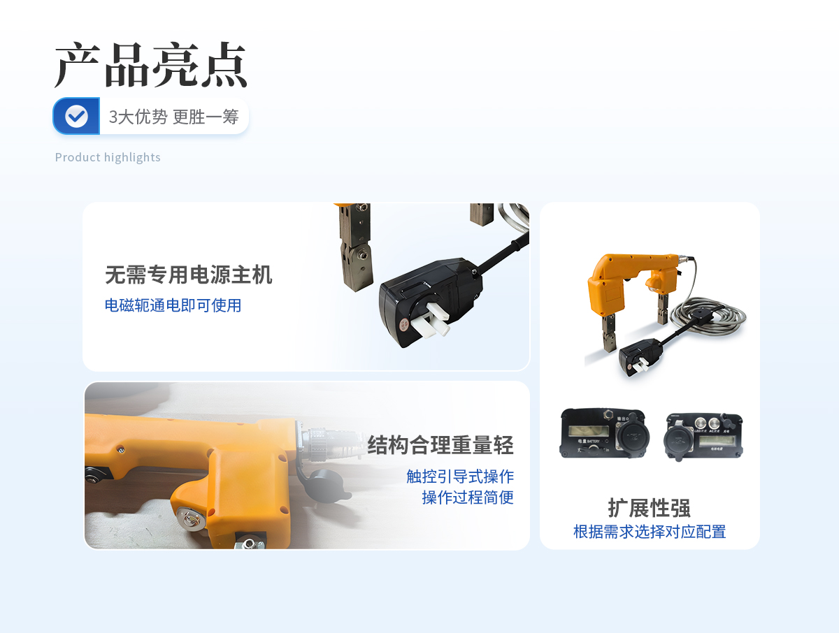 1、 无需专用电源主机,电磁轭通电即可使用; | 2、 体积小巧,重量轻; | 3、 开模制作,结构合理,手感舒适; | 4、 磁轭标配白光灯,可选荧光灯(不额外加费用); | 5、 配专用仪器箱; | 6、 扩展性强,可根据需要增配对应的专用电池包,通过专用电源来实现交流、直流磁化功能。可满足不方便拖电源线的场所使用。 |