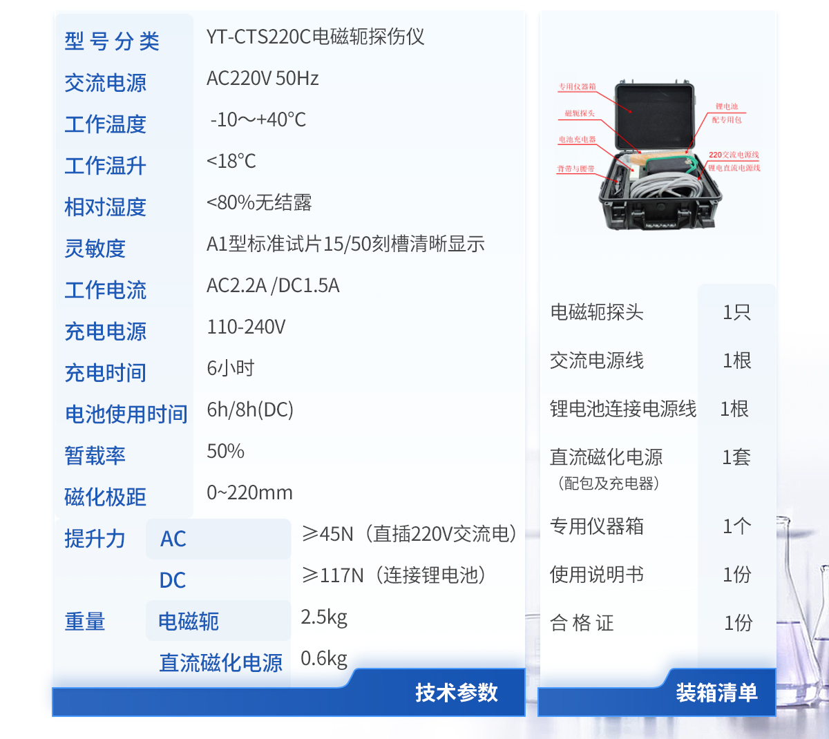 型 号 分 类:YT-CTS220C电磁轭探伤仪 | 交流电源:AC220V 50Hz | 工作温度:-10~+40℃ | 工作温升:<18℃> | 相对湿度:<80%无结露> | 灵敏度:A1型标准试片15/50刻槽清晰显示 | 工作电流:AC2.2A /DC1.5A | 充电电源:110-240V | 充电时间:6小时 | 电池使用时间:6h/8h(DC) | 暂载率:50% | 磁 化 极 距:0~220mm | 提升力:A C ≥45N(直插220V交流电) | 重量: (1)电磁轭:2.5kg (2)直流磁化电源(锂电池):0.6kg |