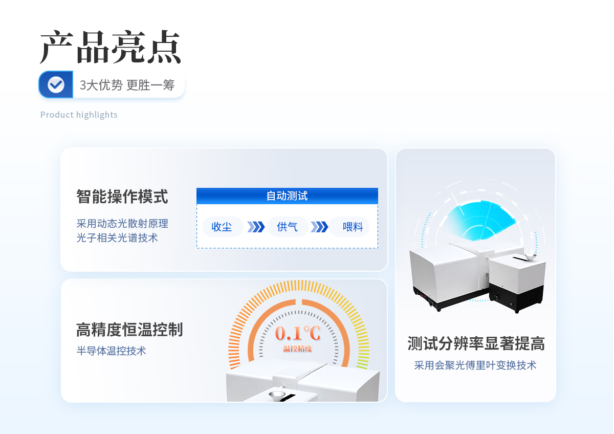 | 光路设计:采用会聚光傅立叶变换技术,使散射光不受透镜孔径限制;采用双谱面光路设计,有效扩大测量范围至2000微米;独创双激光正交光路使用半导体辅助激光器测量侧向散射0.0155度至164度,将测量范围进一步扩展。 | 量程扩大:测试范围下限显著扩大到0.01um,特别适合样品颗粒度小的用户,对亚微米颗粒的测试效果达到国际水准。 | 全内置分散系统:将超声分散、机械搅拌、循环通道合理的集成于仪器内部,保证颗粒测试过程中的均匀分散和分布,有效地避免了外置分散系统因管路长而导致的颗粒分布不均匀、大颗粒沉积等现象,保证了测试结果的准确性。 | 智能操作模式:具有智能化全自动操作模式,实现一键测试,即只要根据提示加入样品,点击“自动测试”,所有操作过程包括进水、分散、循环、测试、清洗、数据记录、数据分析、保存及打印等全部自动完成,不仅减轻了测试人员的工作量,而且消除了人为因素的干扰误差,进一步提高了测试的精度和结果的真实性。 | 全自动对中系统:采用精密四项混合式步进电机组成光路自动对中系统,微动精度达到0.1um,使仪器光路始终处于**状态,在消除手动对中光路所带来的麻烦和困难的同时也提升了测试结果的准确性和稳定性。 | 权威的校准方式:在整个测试范围内采用国家粒度标准物质连续进行校准,只需一年标定一次仪器就可以。校准方式简单快捷。 | 无约束自由拟合技术:无约束自由拟合技术,粒度分析不受任何函数限制,可真实的反映颗粒的分布状态 |