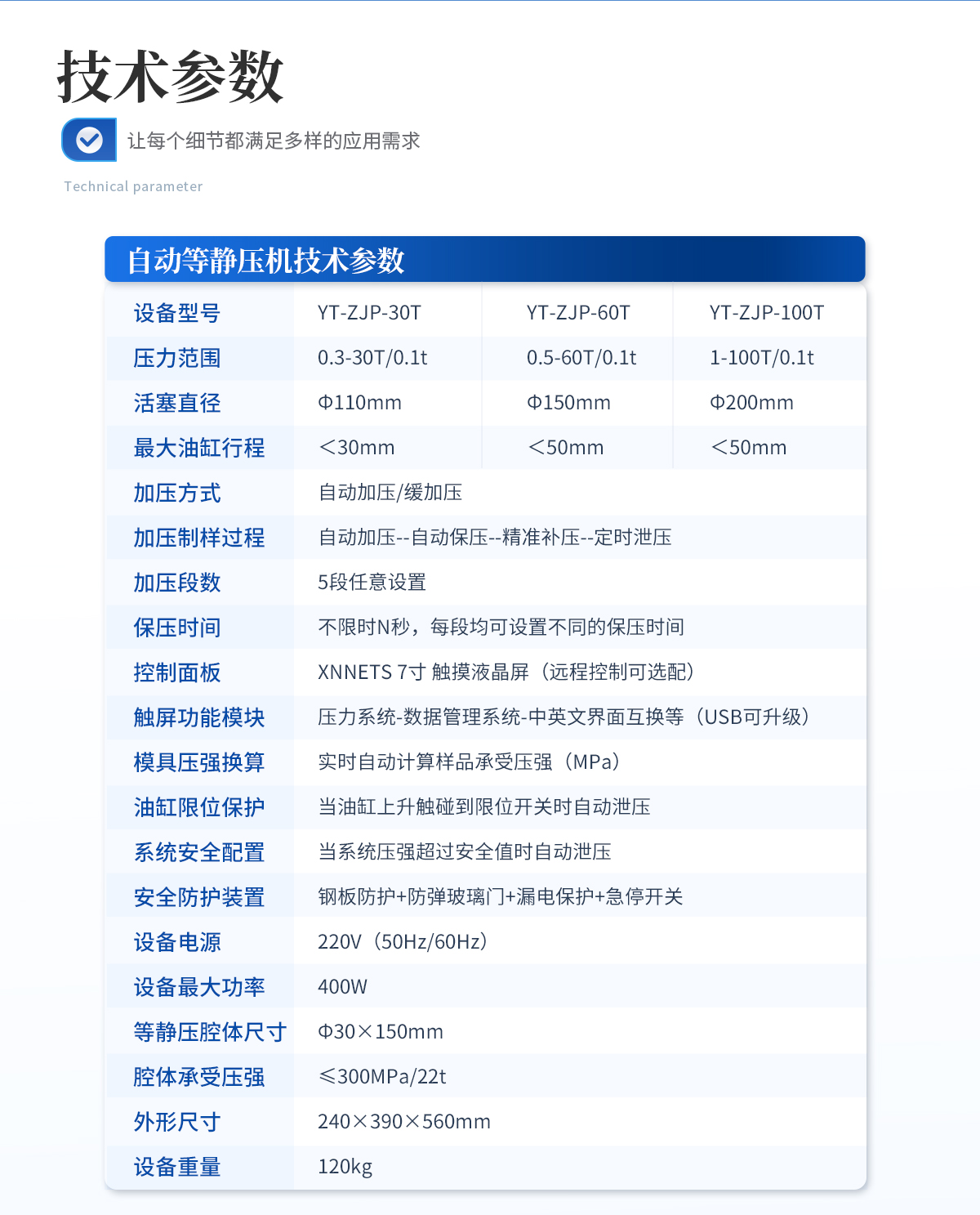 规格型号:YT-DJP-60T | 压力范围:0.5-60T/0.1t | 活塞直径 :Φ150mm | **油缸行程:<50mm | 控制面板:XNNETS 4.3寸 触摸液晶屏 | 加补压方式:电动加压/缓加压/自动补压,手动泄压 | 保压时间:手动控制 | 压力稳定性:≤1MPa/10min | 油缸限位保护:当油缸上升触碰到限位开关时自动泄压 | 安全防护装置:钢板防护+防弹玻璃门+漏电保护+急停开关 | 设备电源:220V(50Hz/60Hz) | 设备**功率:400W | 等静压腔体尺寸:Φ50×150mm | 腔体承受压强:≤300MPa/60t | 外形尺寸: 405×470×720mm | 设备重量: 200kg | 配置说明:油压机1台,等静压腔体1套!可根据需求定制500MPa等静压机或橡胶模具 |