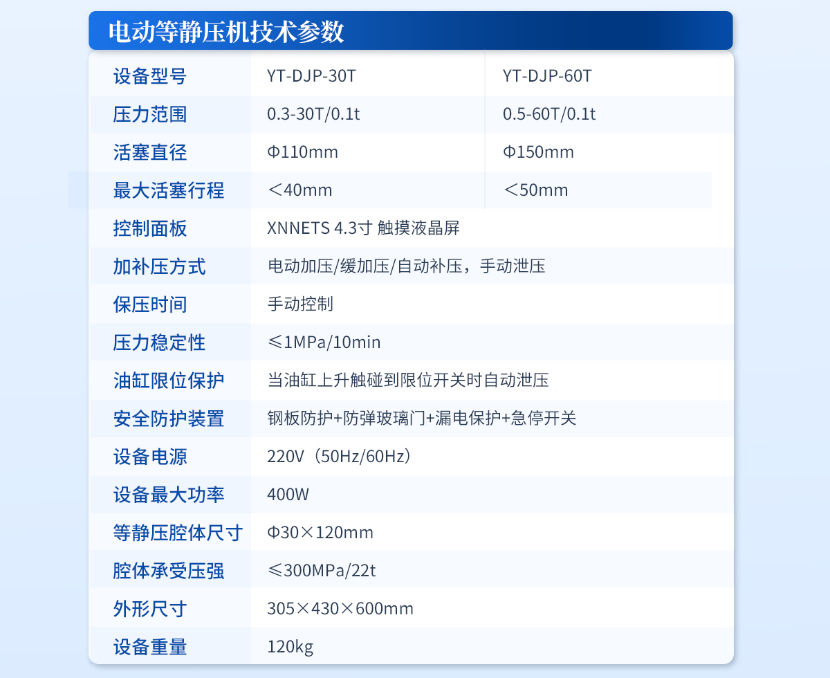 规格型号:YT-SJP-20T | 压力范围:0-20T/28.4MPa | 压力换算:1MPa=0.7t/1t=1.42MPa | 活塞直径:Ф95mm | **活塞行程: <30mm 警示!请注意油缸上升高度,切勿超高 | 压力表类型:压力、压强双刻度显示,显示精度1MPa | 加泄压方式:手动加压/缓加压,手动泄压 | 安全防护装置:钢板防护-防弹玻璃门 | 等静压腔体尺寸:Φ22×70mm | 腔体承受压强:≤300MPa/12t | 外形尺寸:305×195×530mm | 设备重量:90kg | 配置说明:油压机1台,等静压腔体1套!可根据需求定制500MPa等静压机或橡胶模具 |